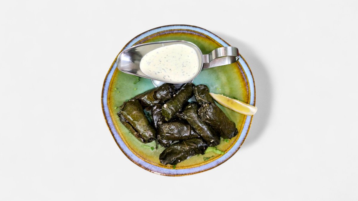 Листья винограда, фарш говяжий, кинза, специи, белый соус