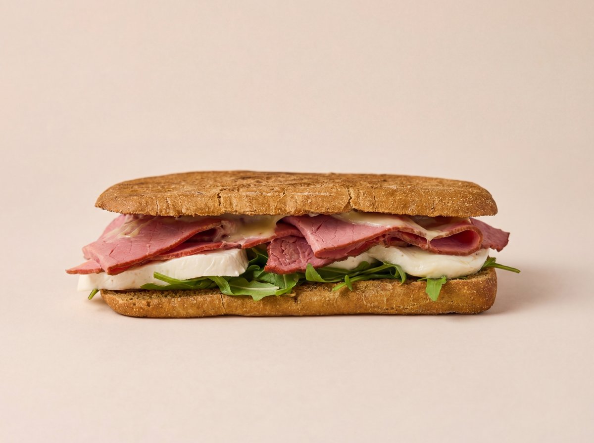 Говяжья ветчина, моцарелла, руккола, медово-горчичный соус, злаковый хлеб