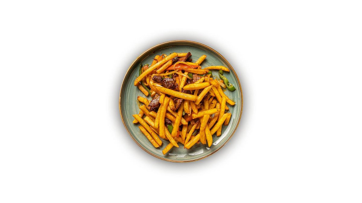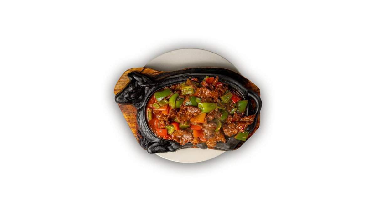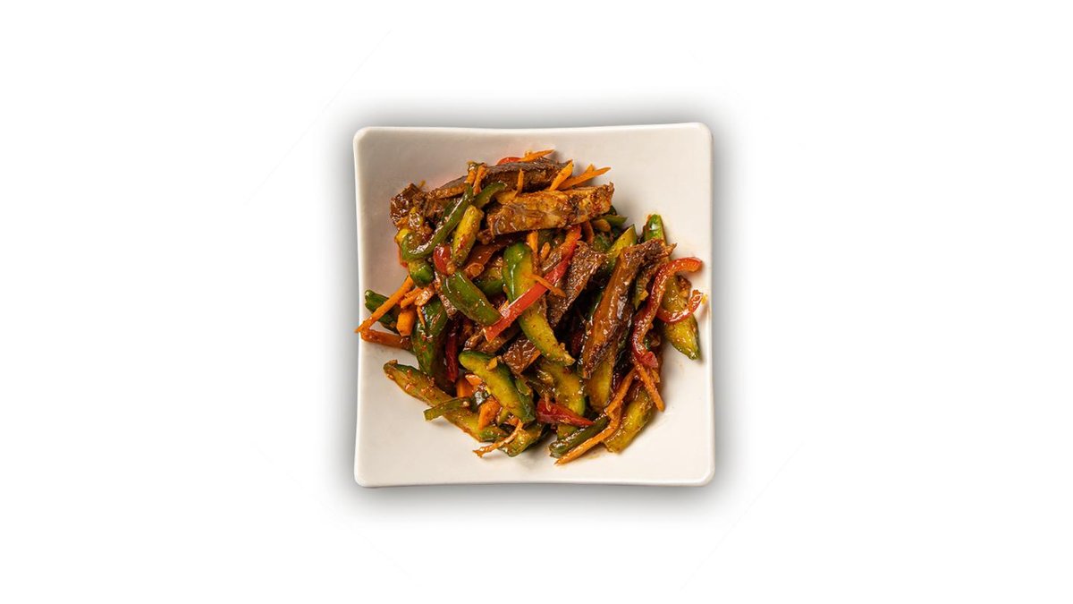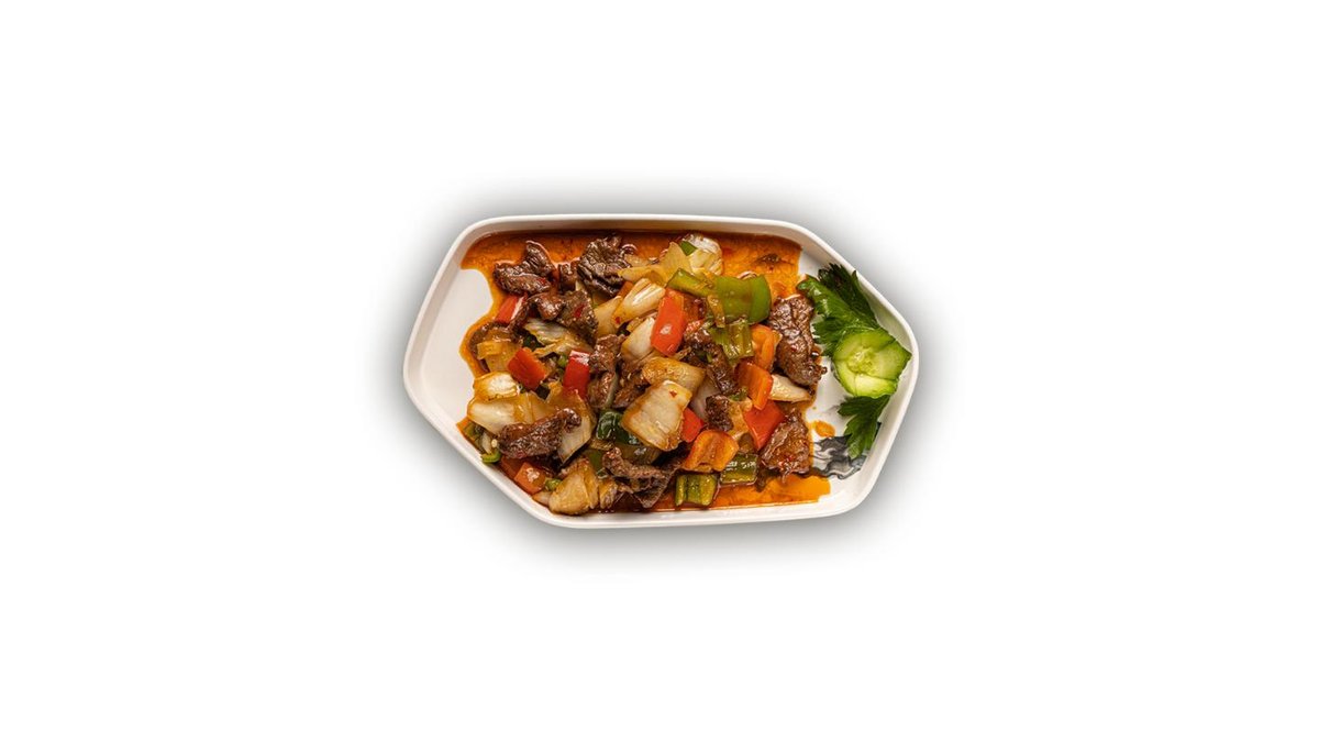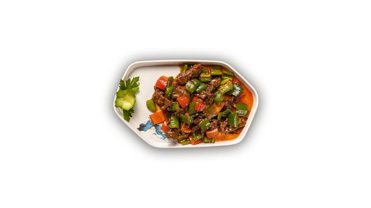 Мясо говядины обжаренное с красным и зелёным полу горьким перцем с добавлением лука и восточных специй