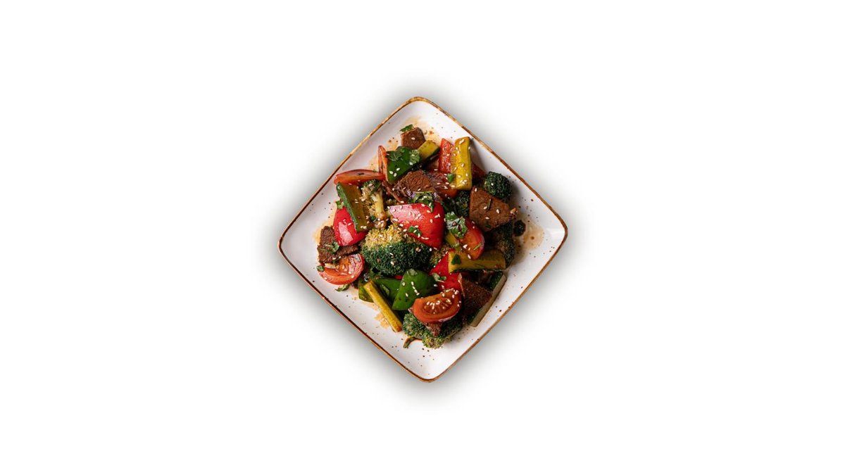 Фирменный салат от шеф-повара. В составе говядина, шпинат, листья салата, шампиньоны, помидоры и кунжут.