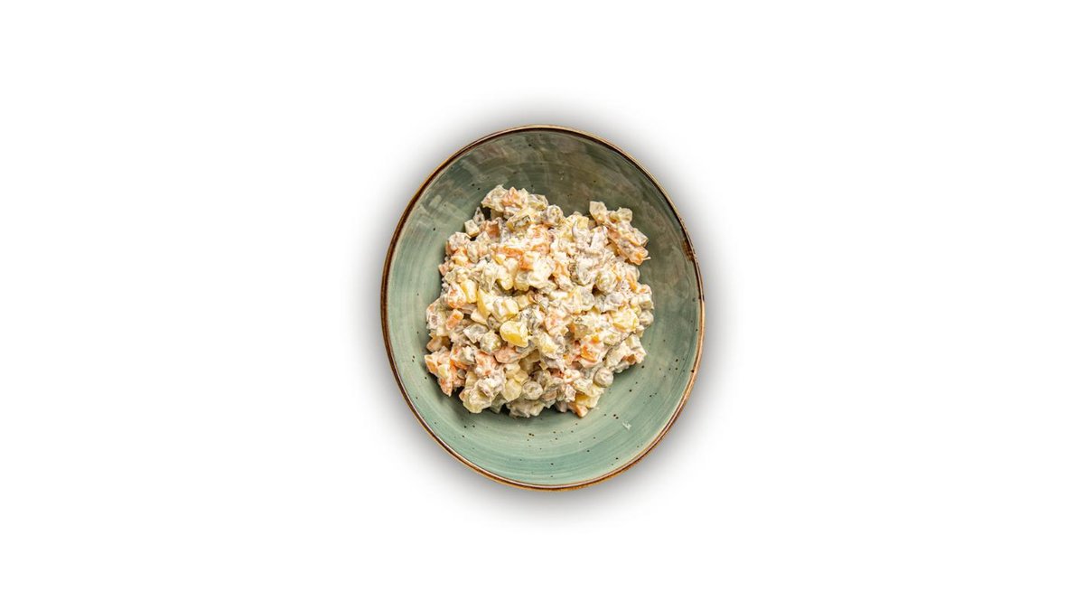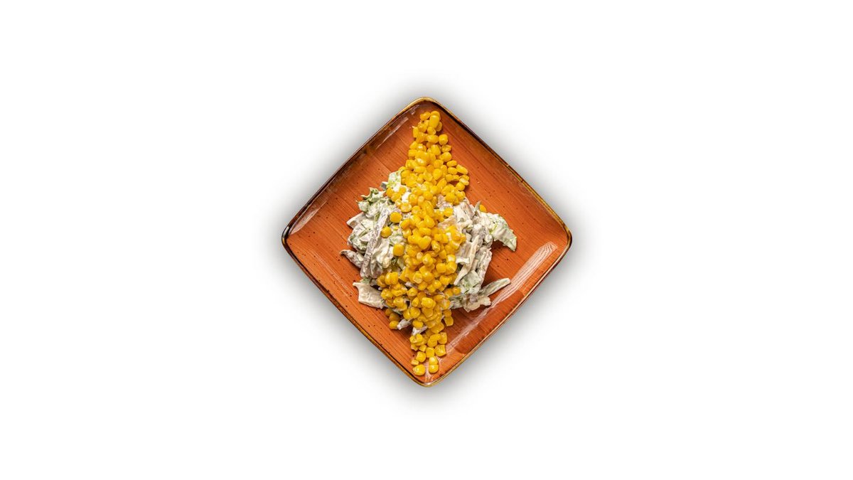 Фирменный салат от шеф-повара на майонезе. В составе отварная курица, кукуруза, картофель, яйцо, солёная огурцы, шампиньоны консервированные, маслины и украшения виде чипсов