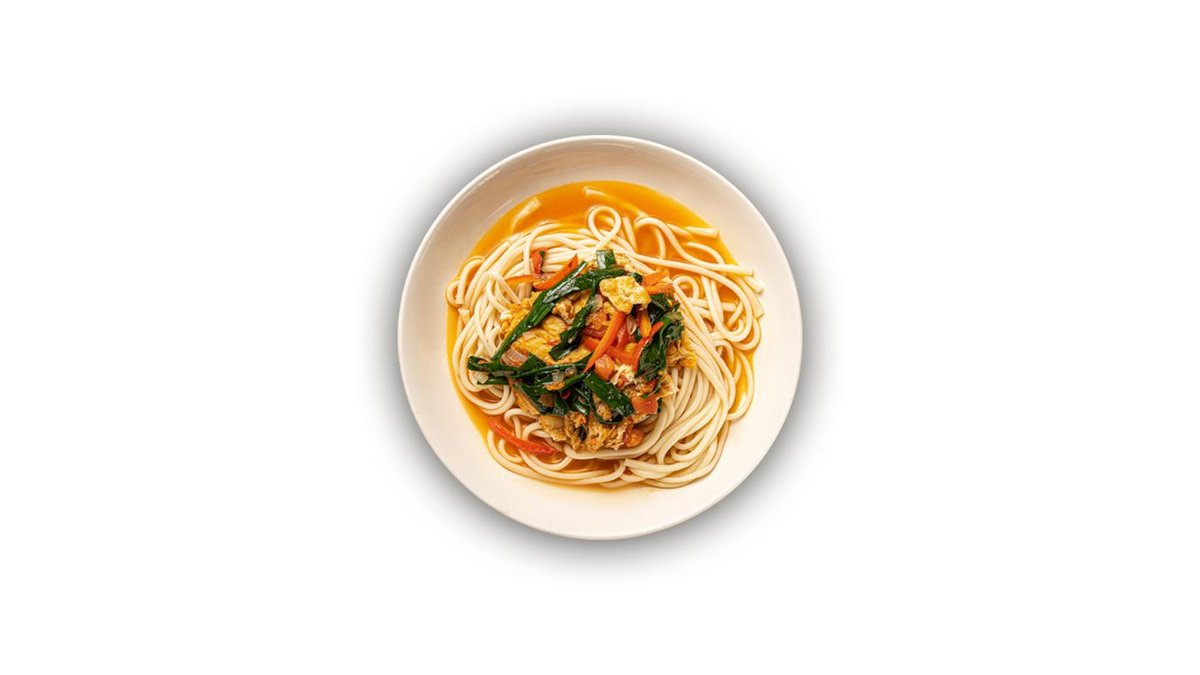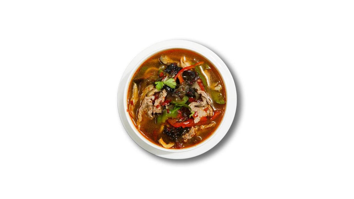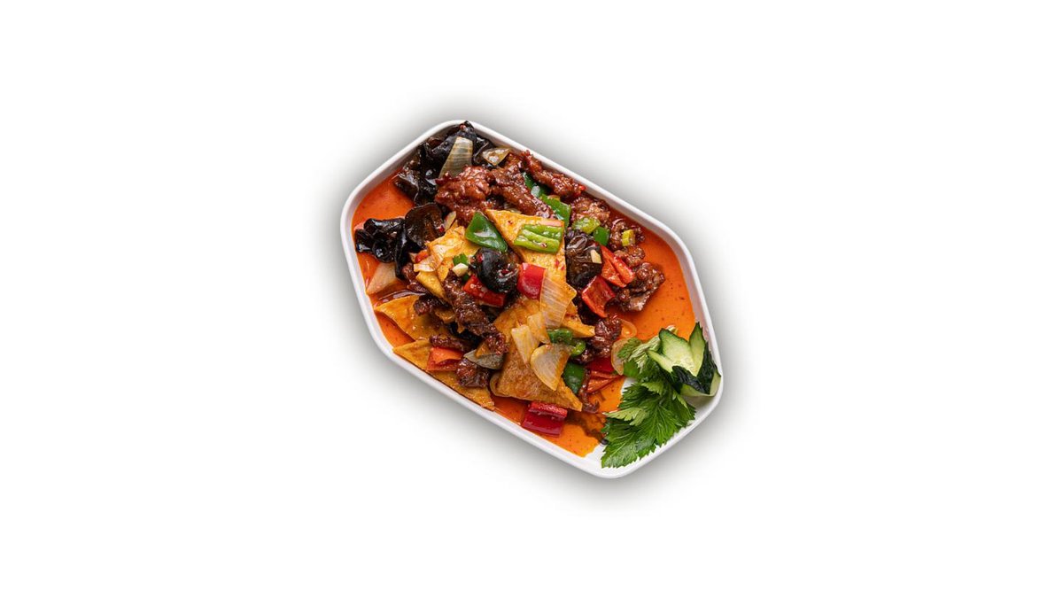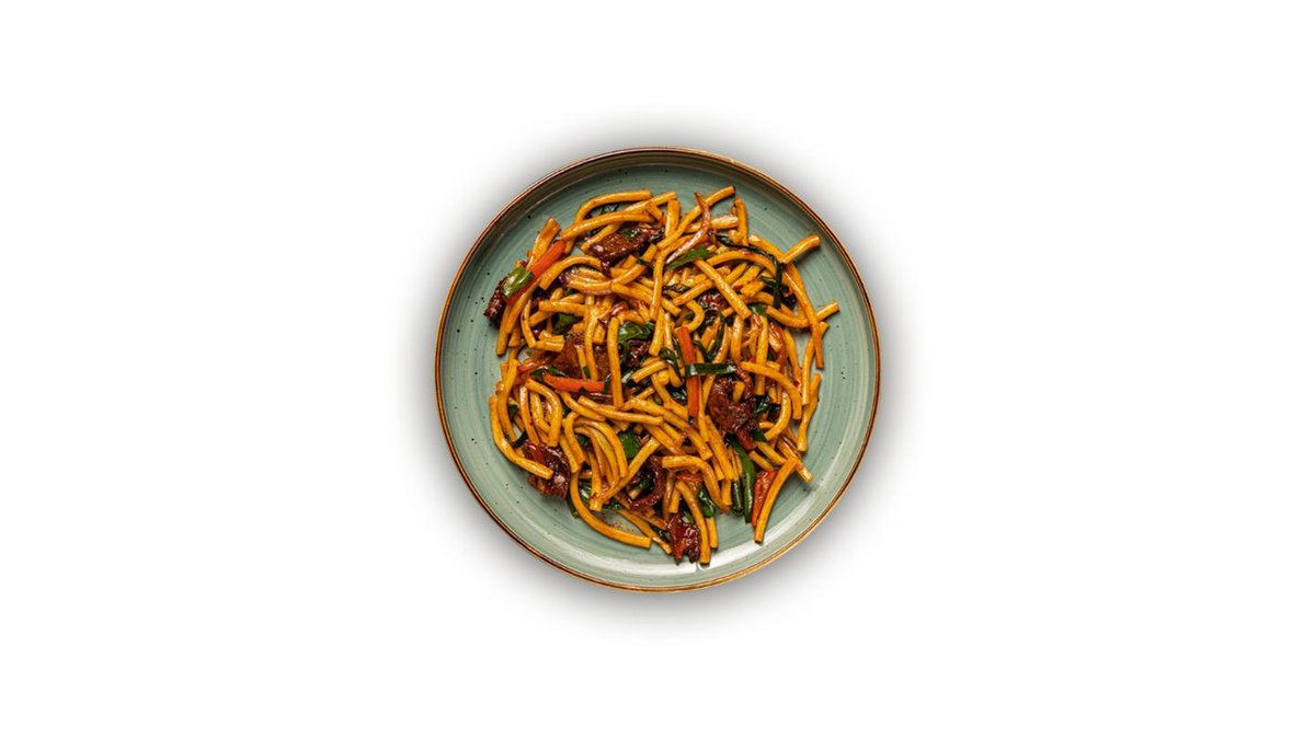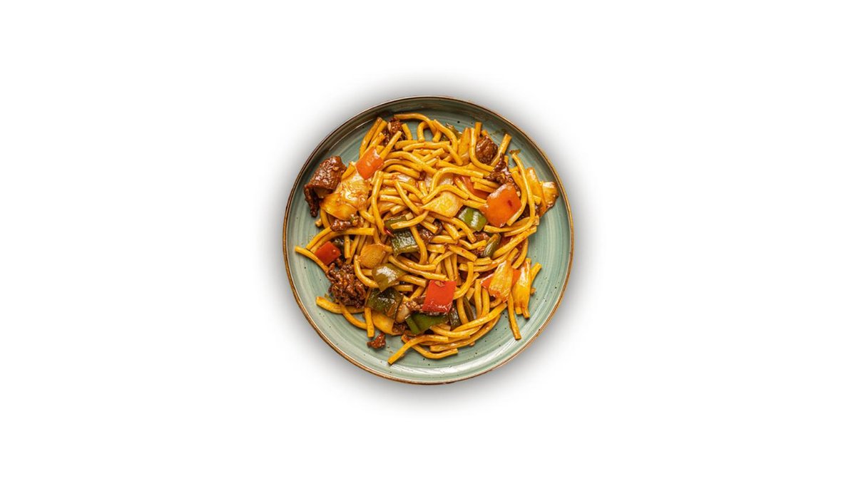 Классический подлив от гуйру лагмана только двойная порция. Мясо говядины пекинская капуста красный и зеленый полу горький перец