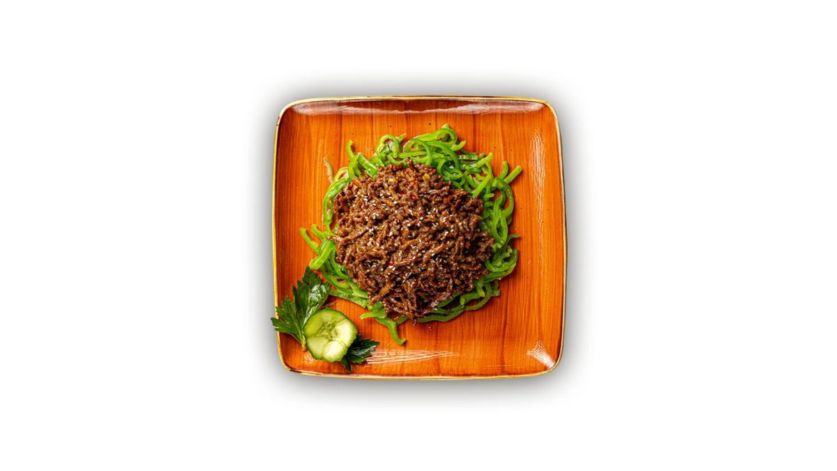 Мясо говядины обжаренные с фунчозой из красным зелёным полу горьким перцем. Спец блюдо от шеф-повара