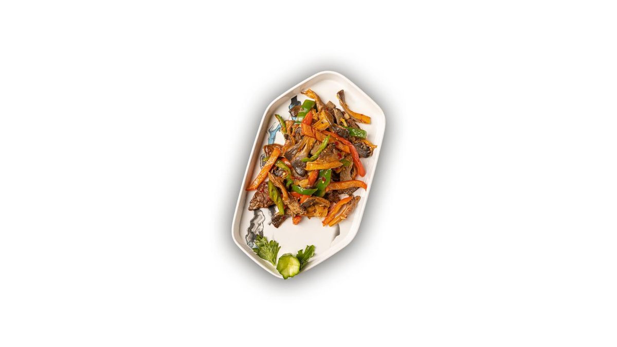Говяжий лытки обжаренные с красным и зелёным полу горьким перцем. Отличный деликатес для многих любителей