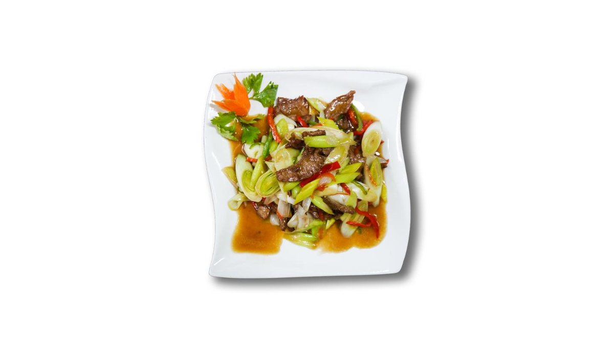 Мясо говядины обжаренные с луком порей с добавлением Острого стручкового перца