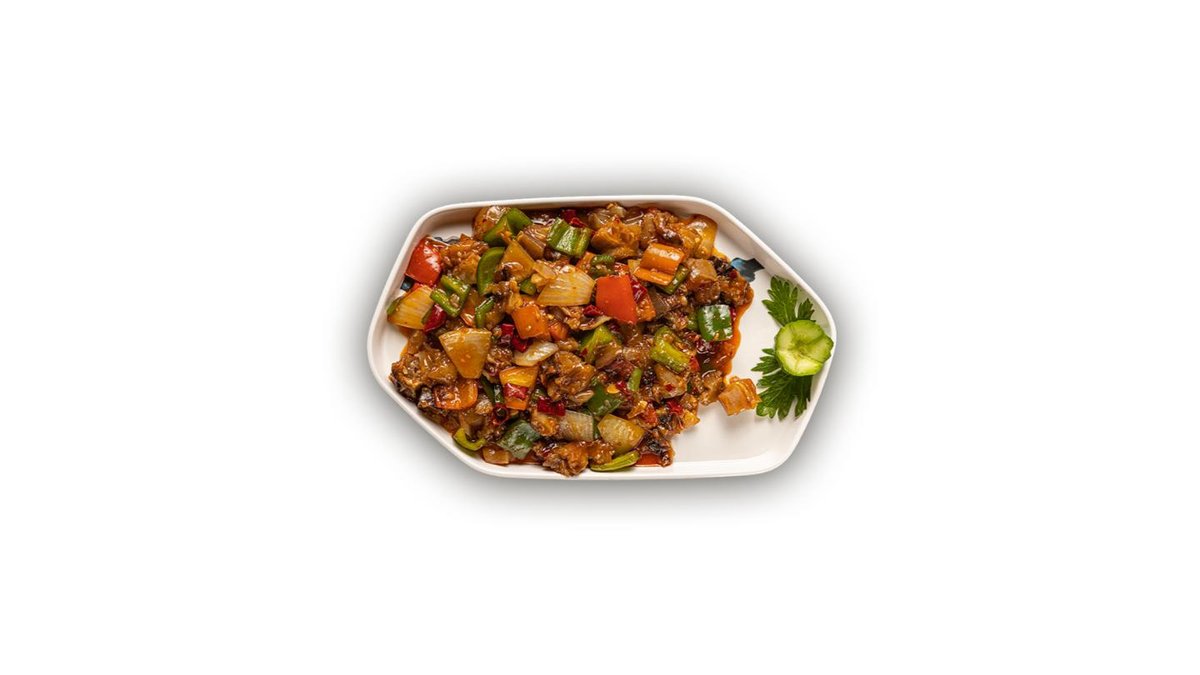 Обжаренные кусочки курицы с косточками с красным и зелёным полу горьким перцем и с добавлением авторских специй от шеф-повара