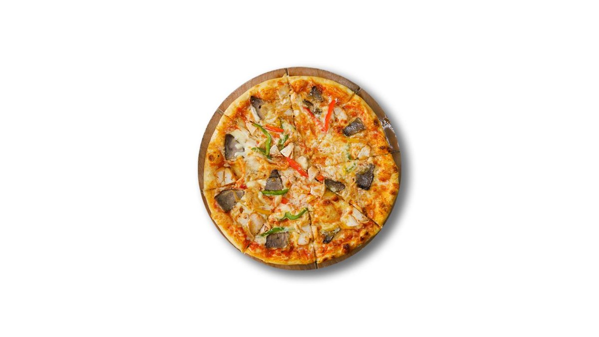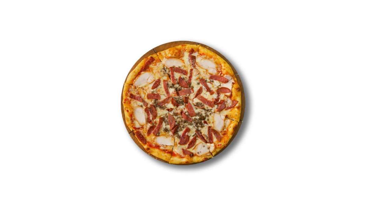 Сыр моцарелла, томатный соус, говядина, курица , перец болгарский .