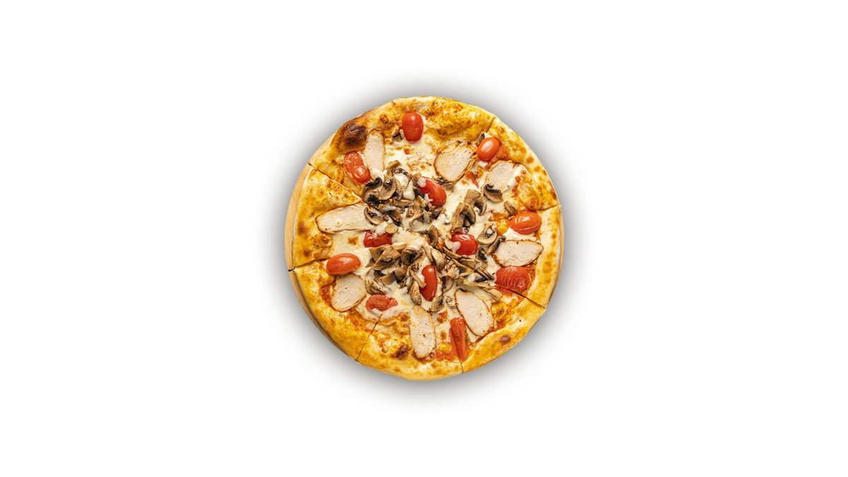 Сыр моцарелла, соус томатный, сыр курица, шампиньоны помидоры Черри
