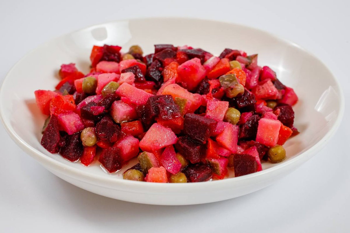 Винегрет — яркий и аппетитный салат с насыщенным вкусом. Отварная свёкла, картофель, морковь, солёные огурцы и квашеная капуста соединяются в гармонии, а лёгкая заправка из масла подчеркивает естественную сладость и кислинку овощей. Классика, проверенная временем. В стоимость включена посуда.