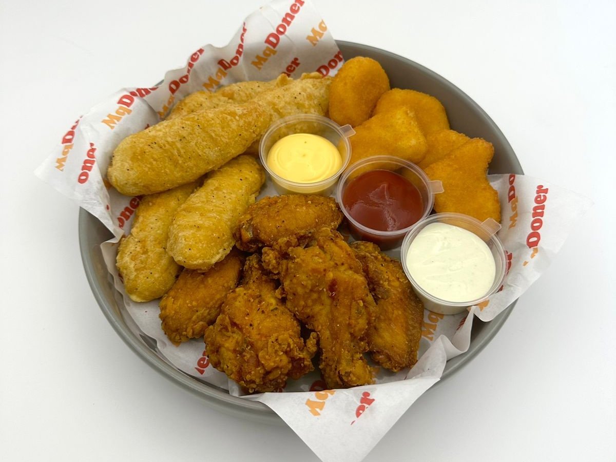 Мини-донер из горячего и свежего куриного мяса с вертела, в составе картофель фри, салат из (капусты, моркови, соленых огурцов), чесночный соус, кетчуп