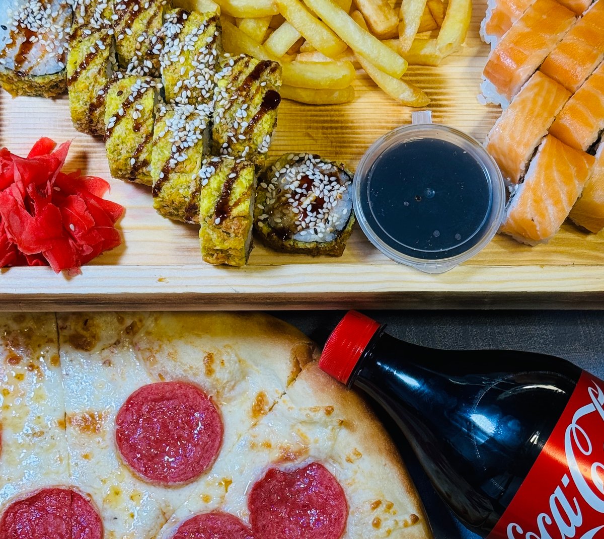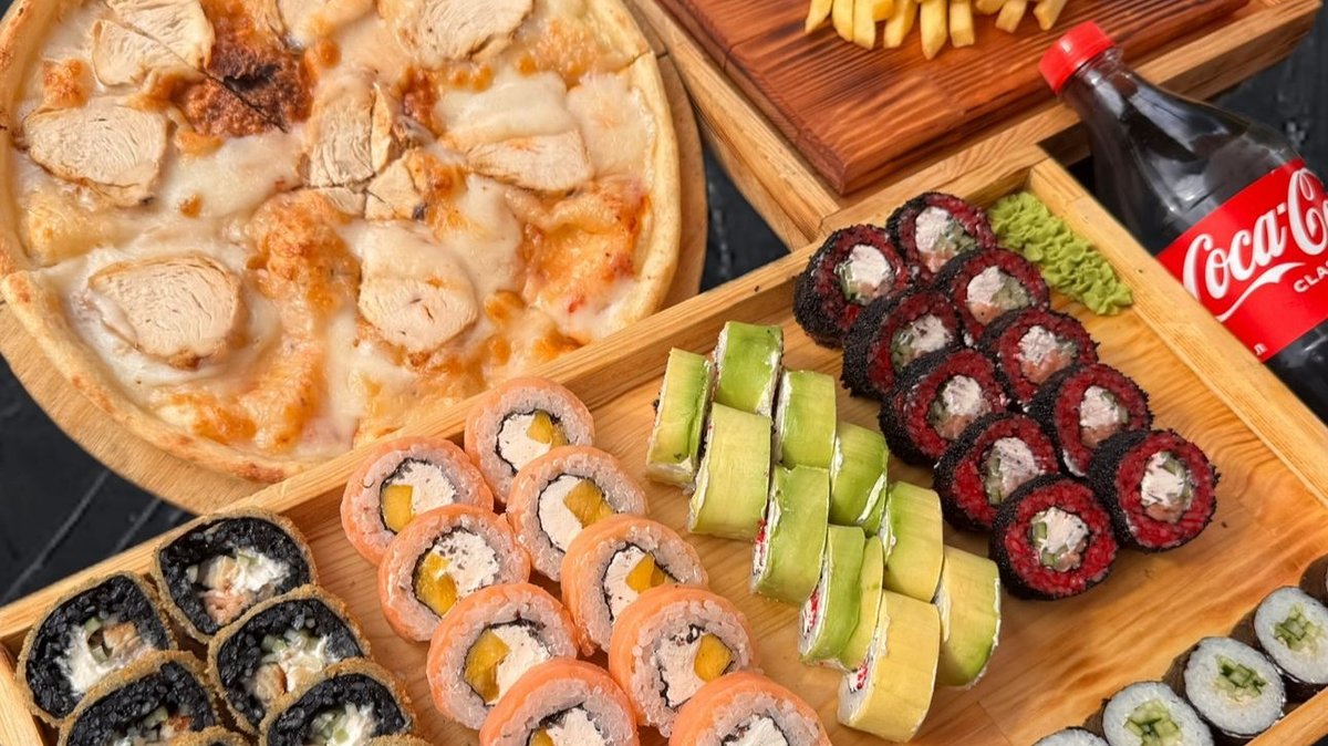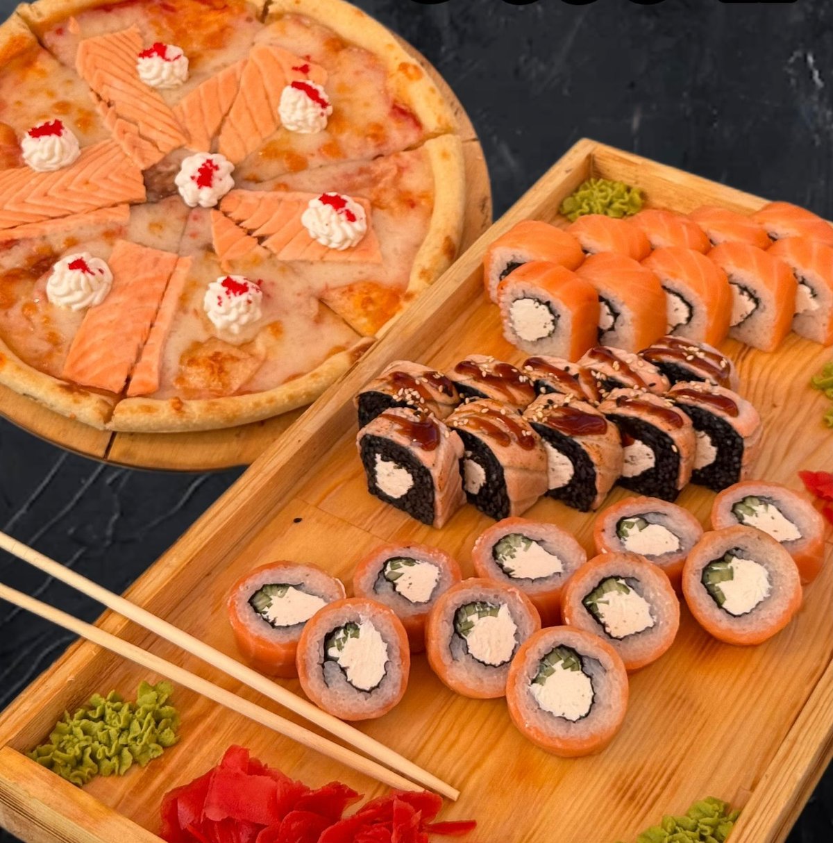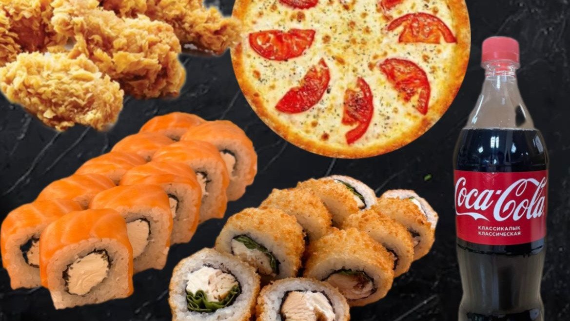 Филадельфия 10 Цезарь 10 Каппа маки 10 Саке маке 10 Пицца Маргарита Фри 1 порция 1 литр кола