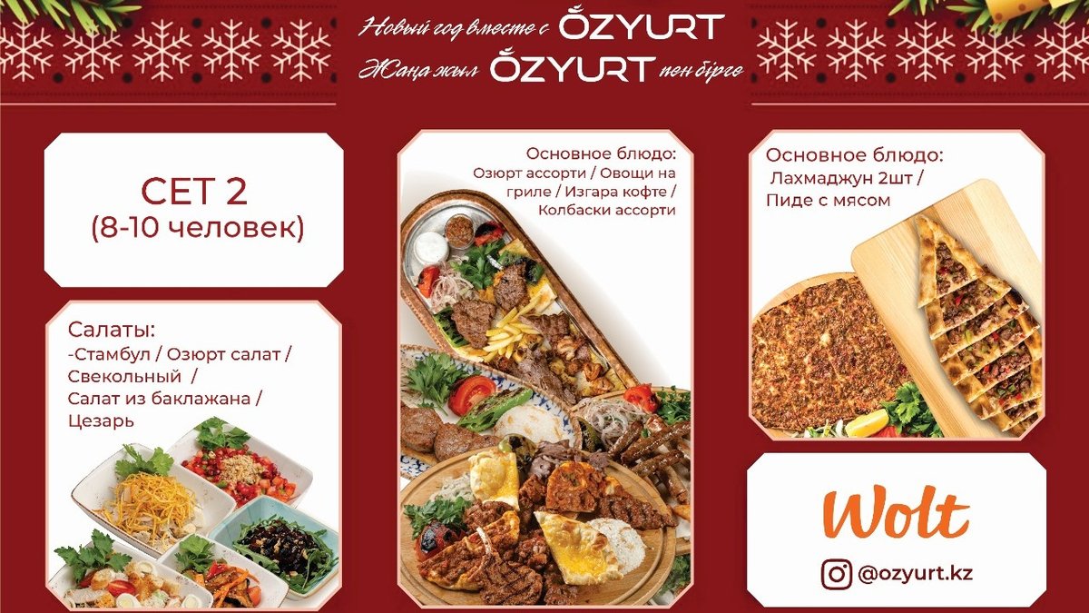 Основное блюдо: -Ozyurt ассорти -Овощи на гриле -Изгара кофте -Колбаски ассорти Салаты: -Стамбул -Ozyurt салат -Свекольный -Салат из баклажана -Цезарь -Лахмаджун 2шт -Пиде с мясом