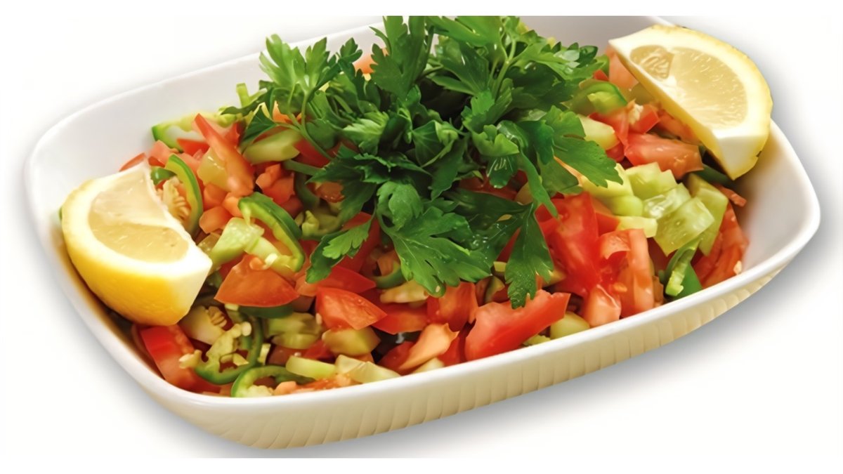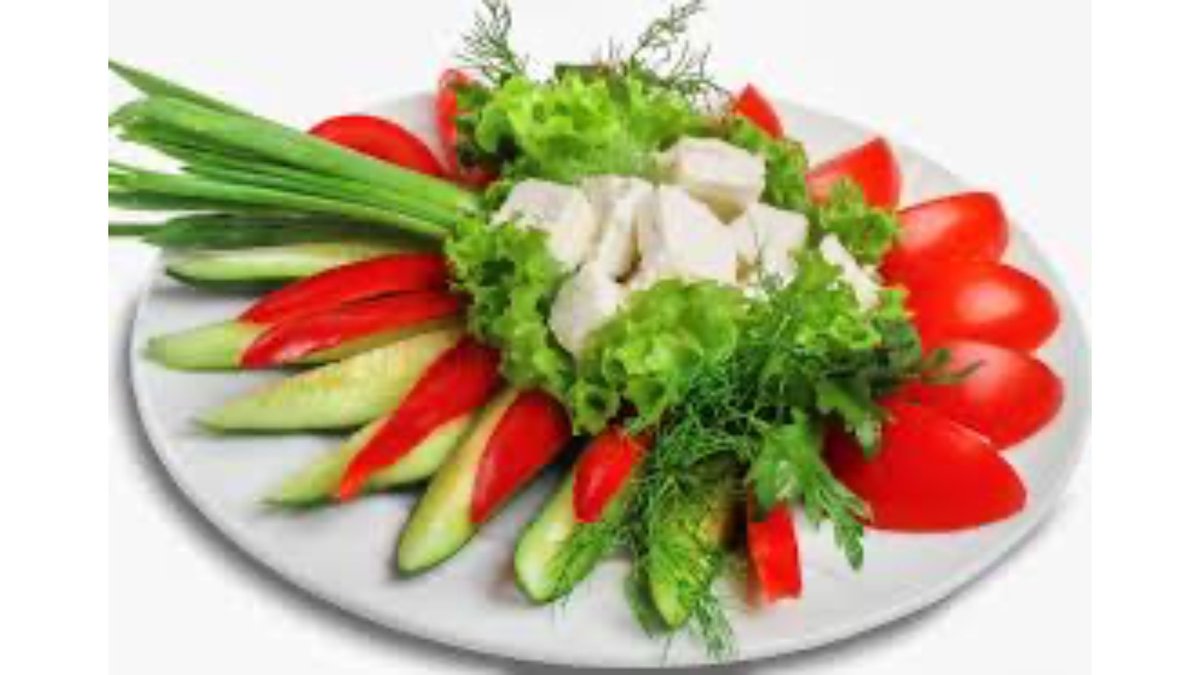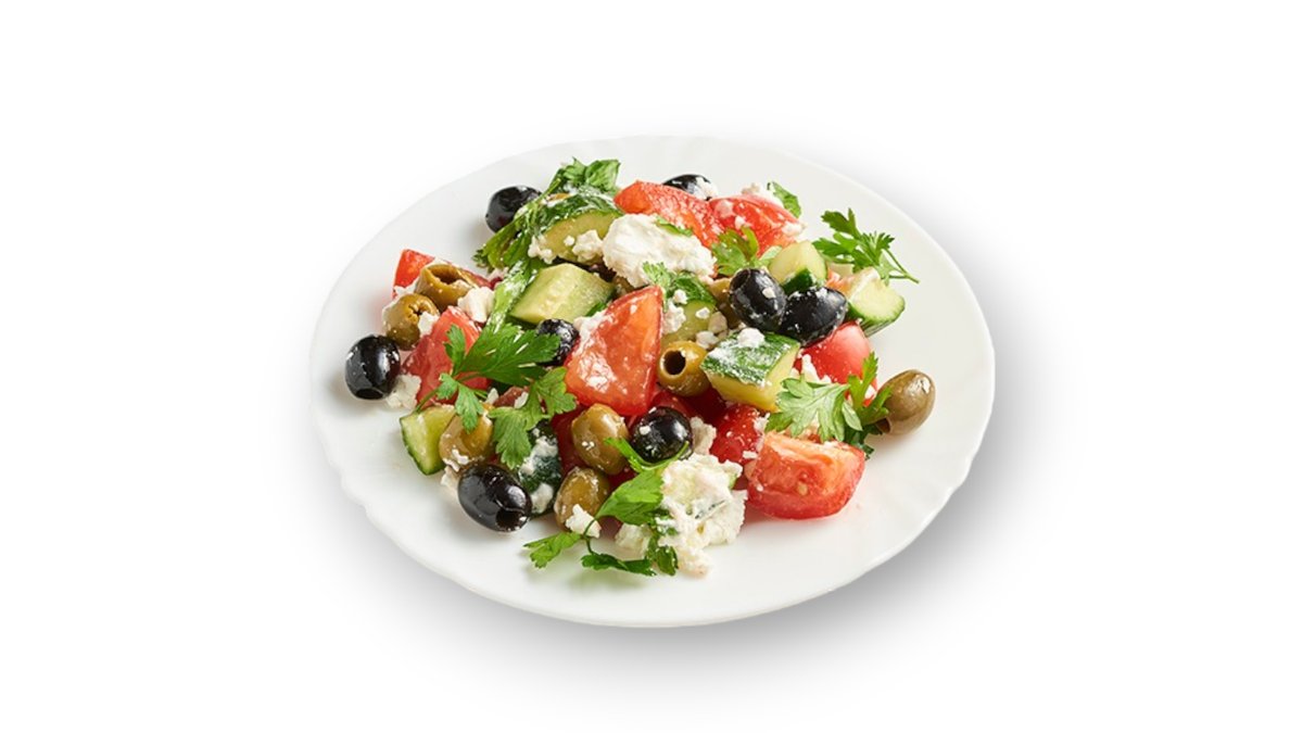 огурцы, помидоры, перец светофор, зелень, лимон, маслины, брынза