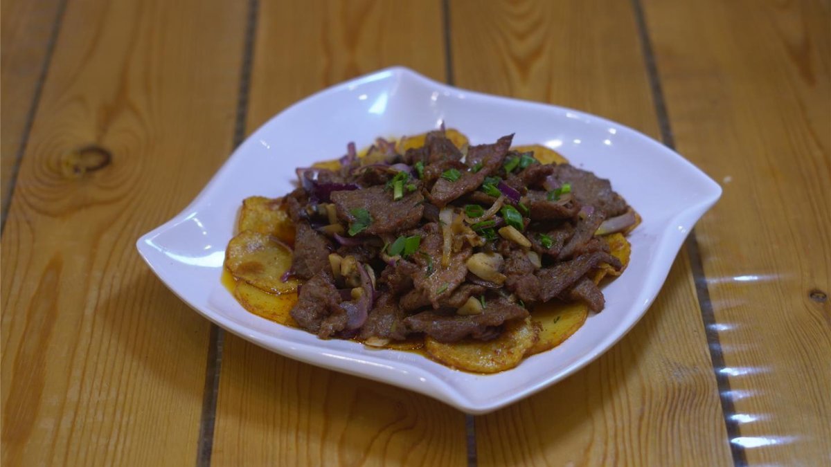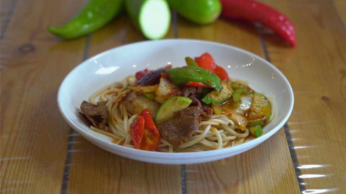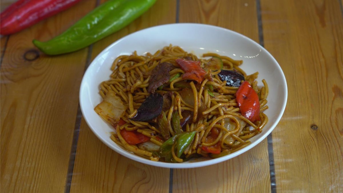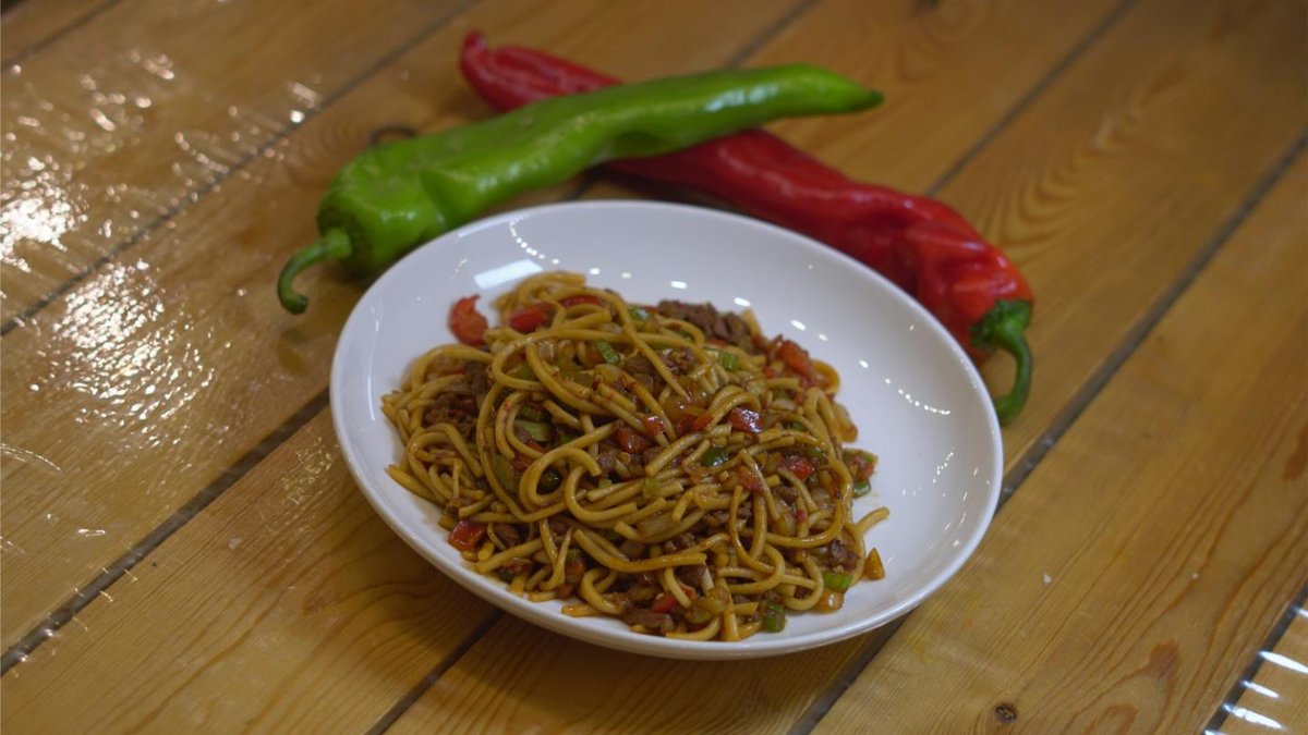 Жареный лагман,говядина,кабачок,полугорький перец,сельдерей,бясай