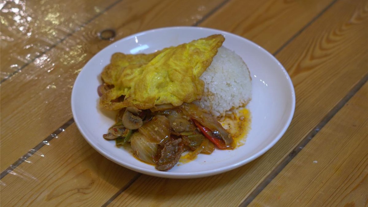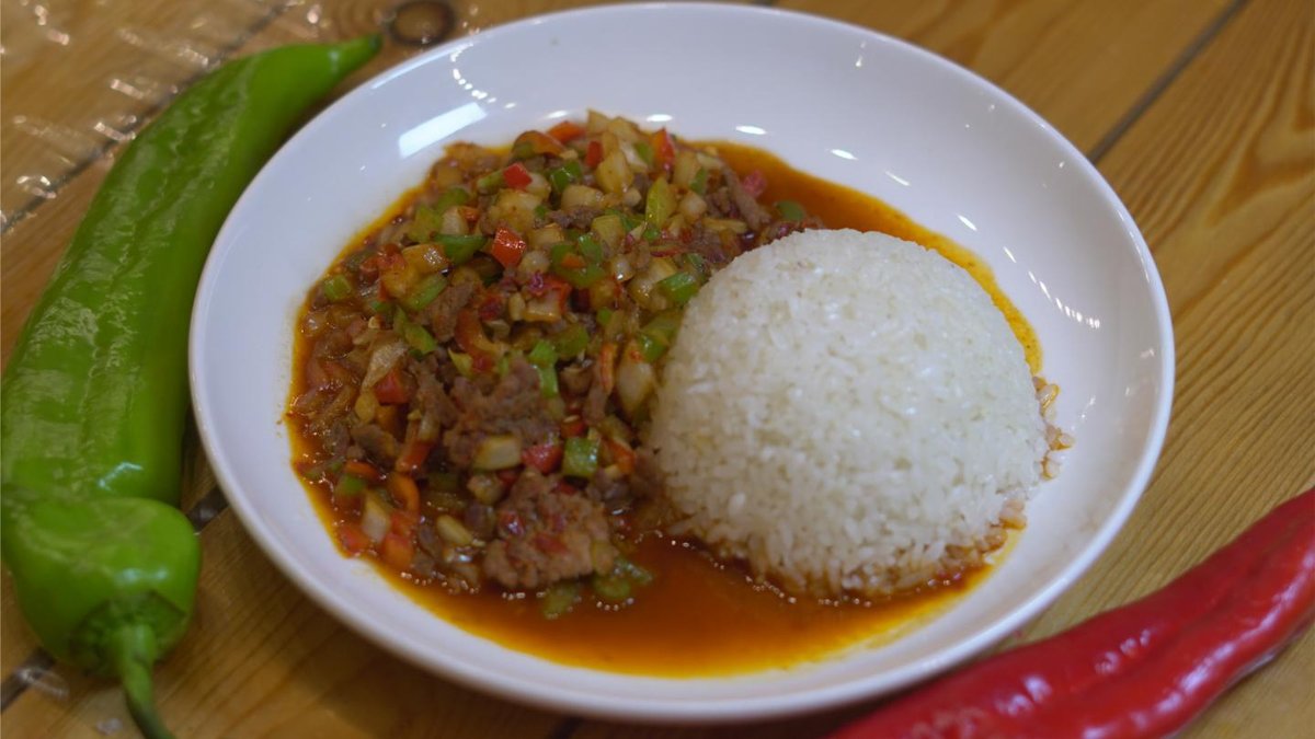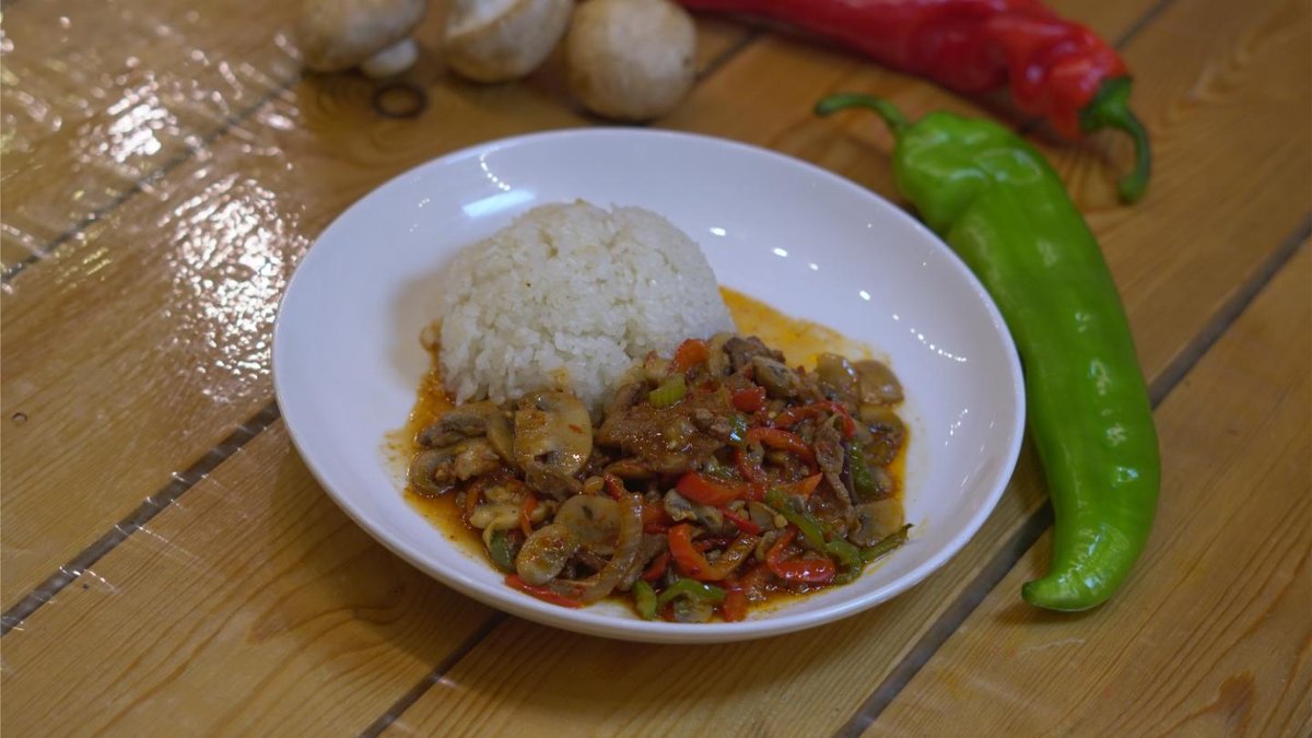 Говядина,грибы,рис,полугорький перец,лук