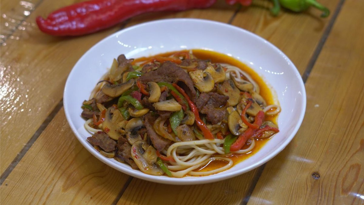 Говядина,лапша,грибы черные,шампиньоны,перец болгарский,перец полугорький