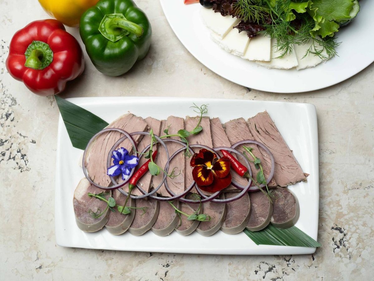 язык отварной, сырная масса, маслины, брынза, кинза, чеснок, сметана