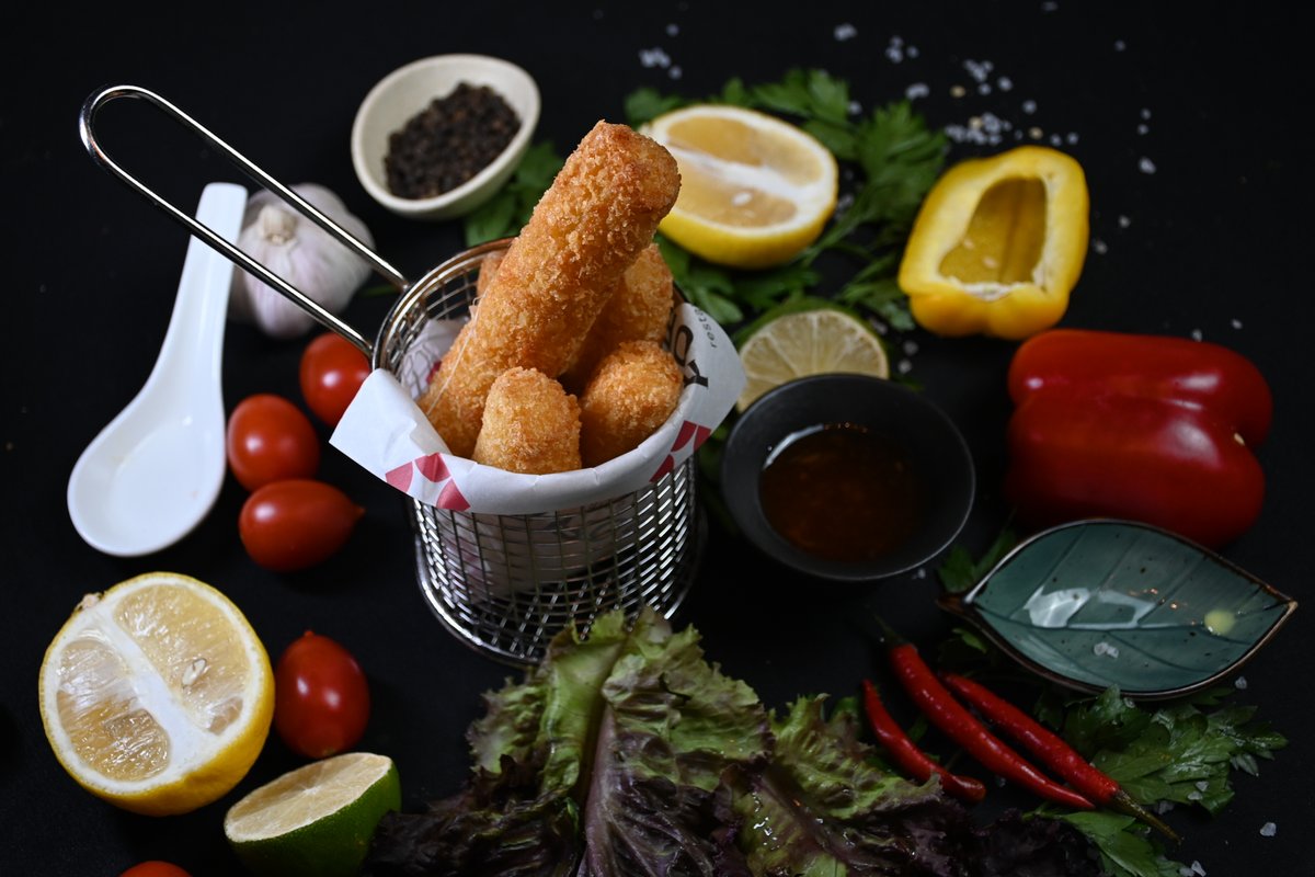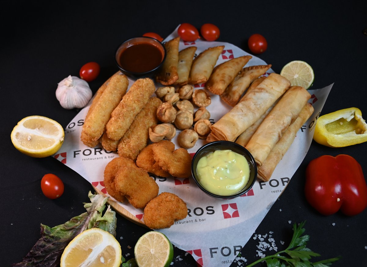 Наггетсы, мини чебуреки, мини пельмешки, сырные палочки, спринг роллы, соусы: барбекю, айоли.
