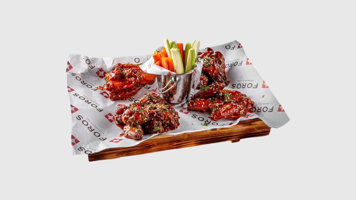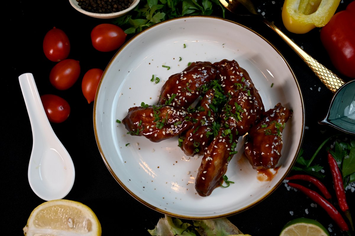 4 вида куриных крылышек в соусах BBQ,терияки,шрирача,медово-горчичный.