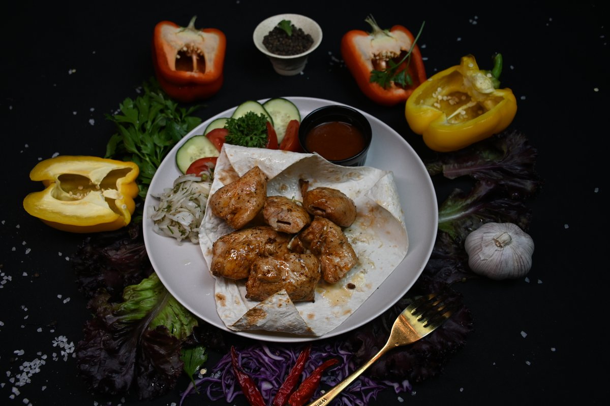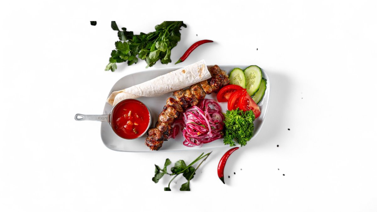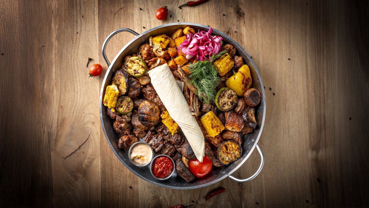 Мякоть баранины, корейка, куриное филе, шашлык куриный , люля баранина, люля курица, картофельные дольки, овощи на гриле, свежие овощи, маринованный лук, лаваш, соусы: шашлычный , айоли.