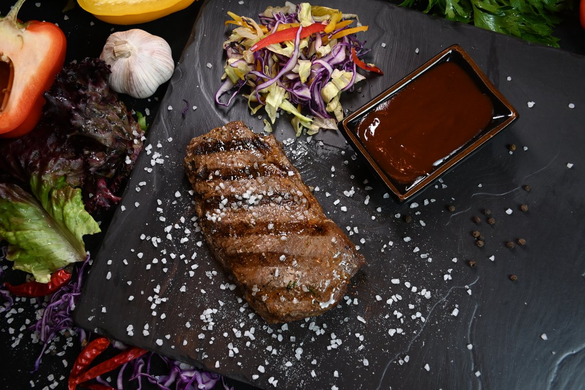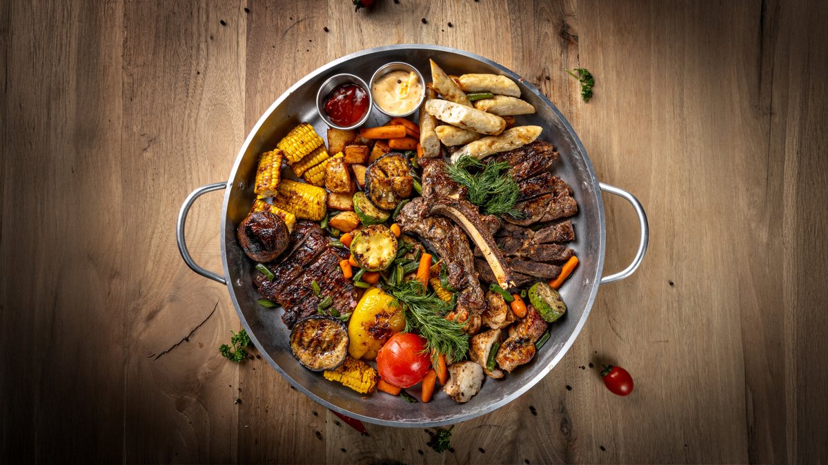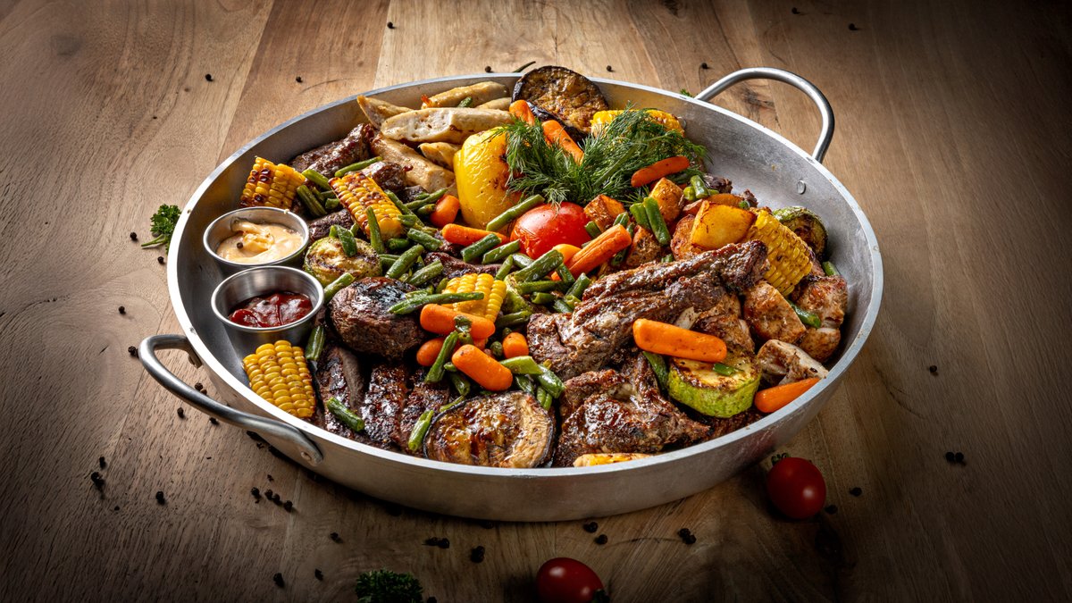 Стейк нью йорк, стейк рибай, шашлык филе куриное, колбаски куриные, овощи на гриле , початки кукурузы, запеченный картофель, соус bbq, соус айоли. Подробное описание