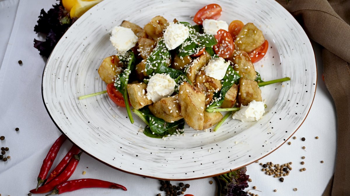 Салат с хрустящими баклажанами и креветками