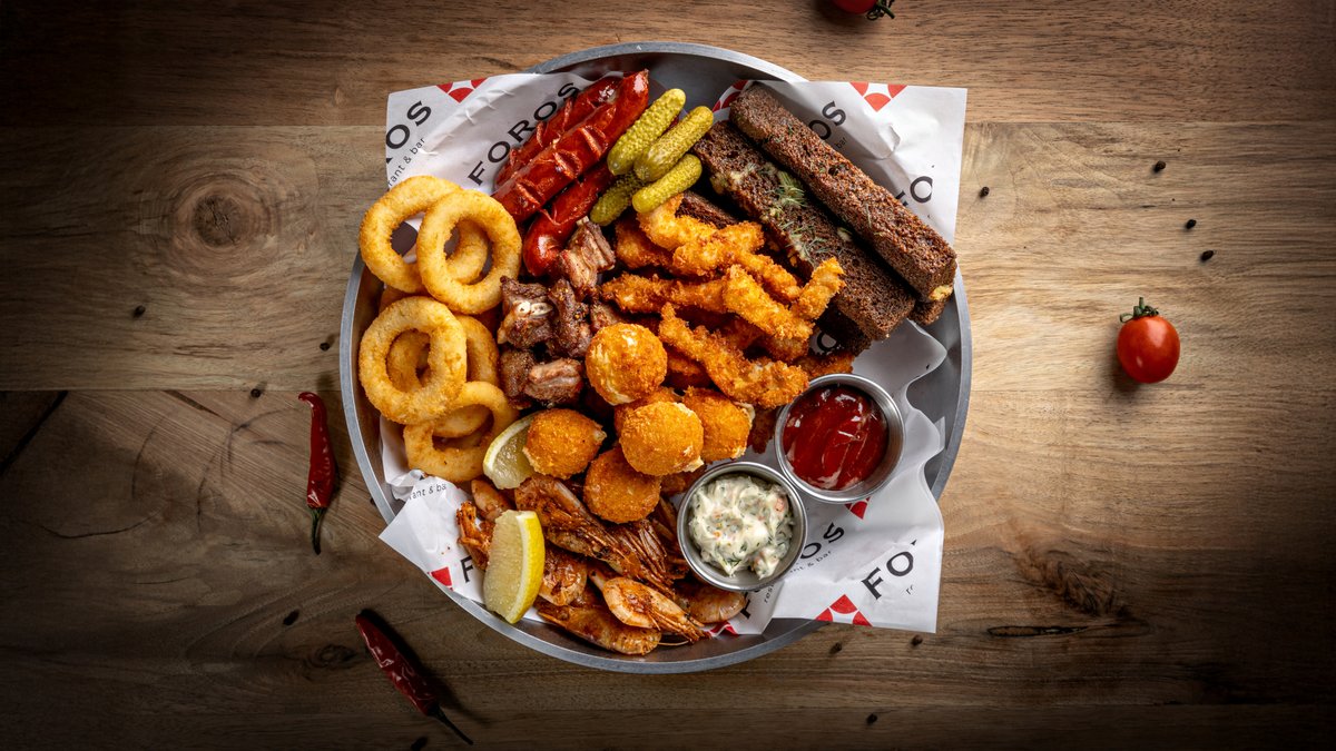 Гренки, креветки, чечил, арахис, луковые кольца, корнишоны, лимон, соусы : барбекю, айоли)