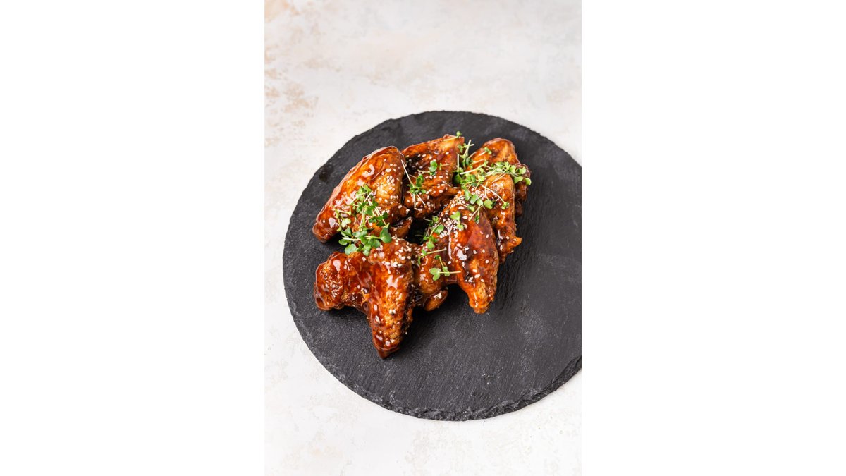 Сочные куриные крылья, обжаренные до хрустящей корочки и щедро покрытые ароматным соусом BBQ с лёгкой сладостью и копчёными нотками. Подаются горячими, с зеленью и дольками лимона. Идеальная закуска — пряная, насыщенная и просто тает в руках.