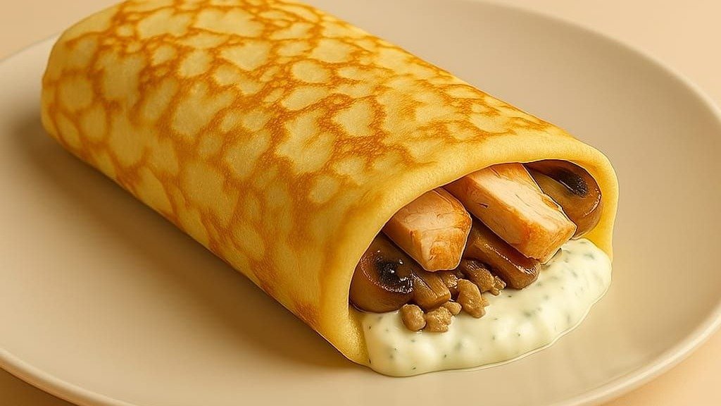 Блин с куриной печенью, морковью и чесночным соусом