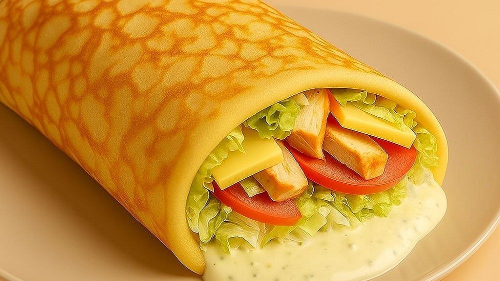 Большой блинчик с запеченной курочкой, свежими овощами, картофелем фри и двумя видами соусов.