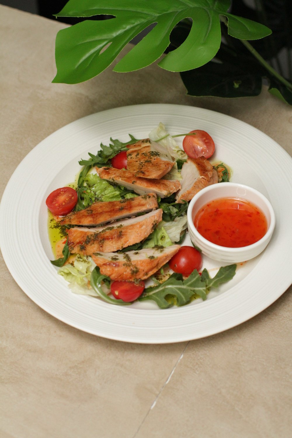 Лист салата, помидоры, соленые огурцы, запеченная курочка, соус цезарь, завернутые в треугольники лаваша и обжаренные на гриле
