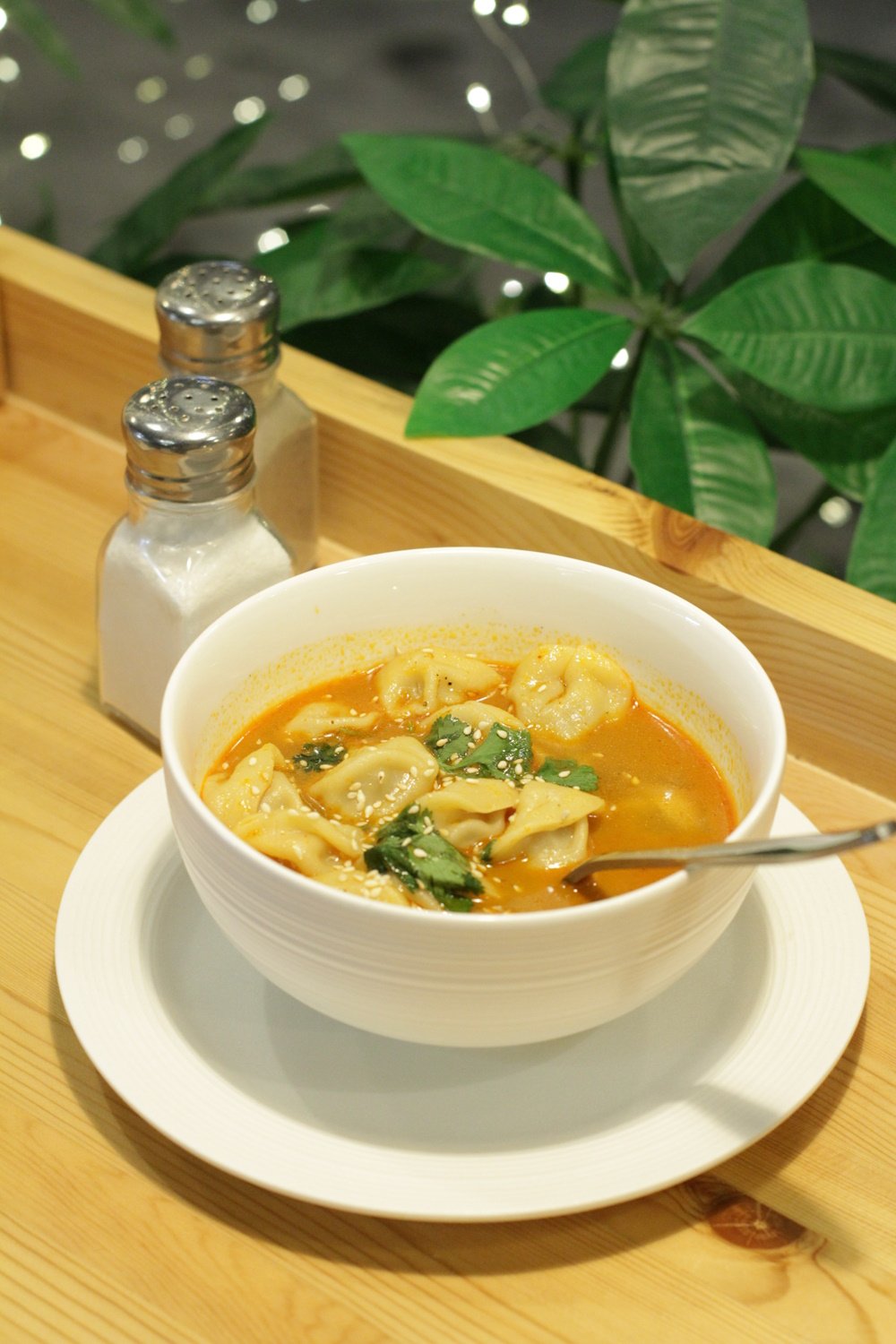 Куриный бульон, грудинка, лапша, яйцо перепелиное, зелень