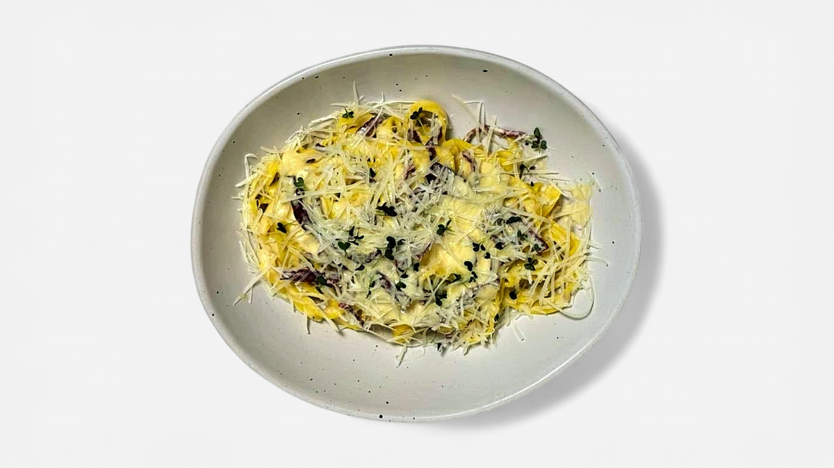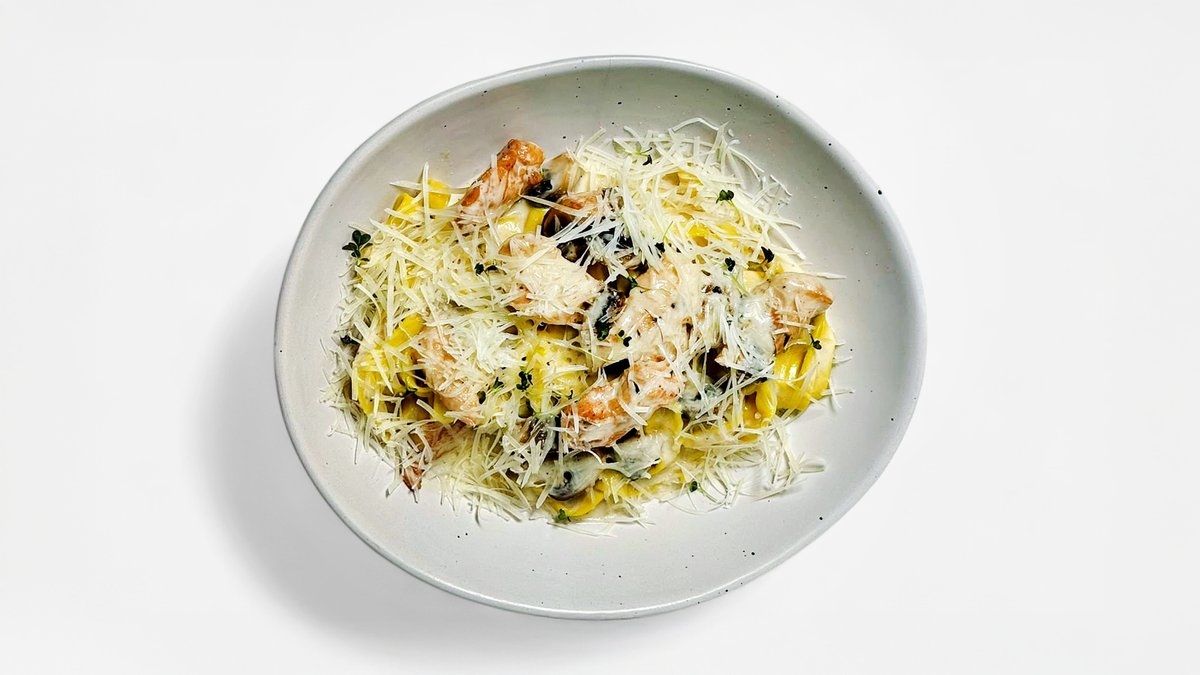 Паста ризони, креветки, черри, кокосовое молоко, лайм, соус Том Ям, пармезан