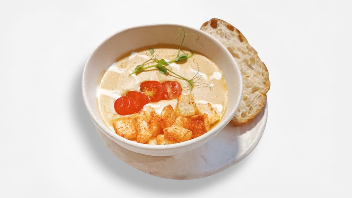 Глазунья, говяжья ветчина, творожный сыр, фасоль, микс зелени, тартин