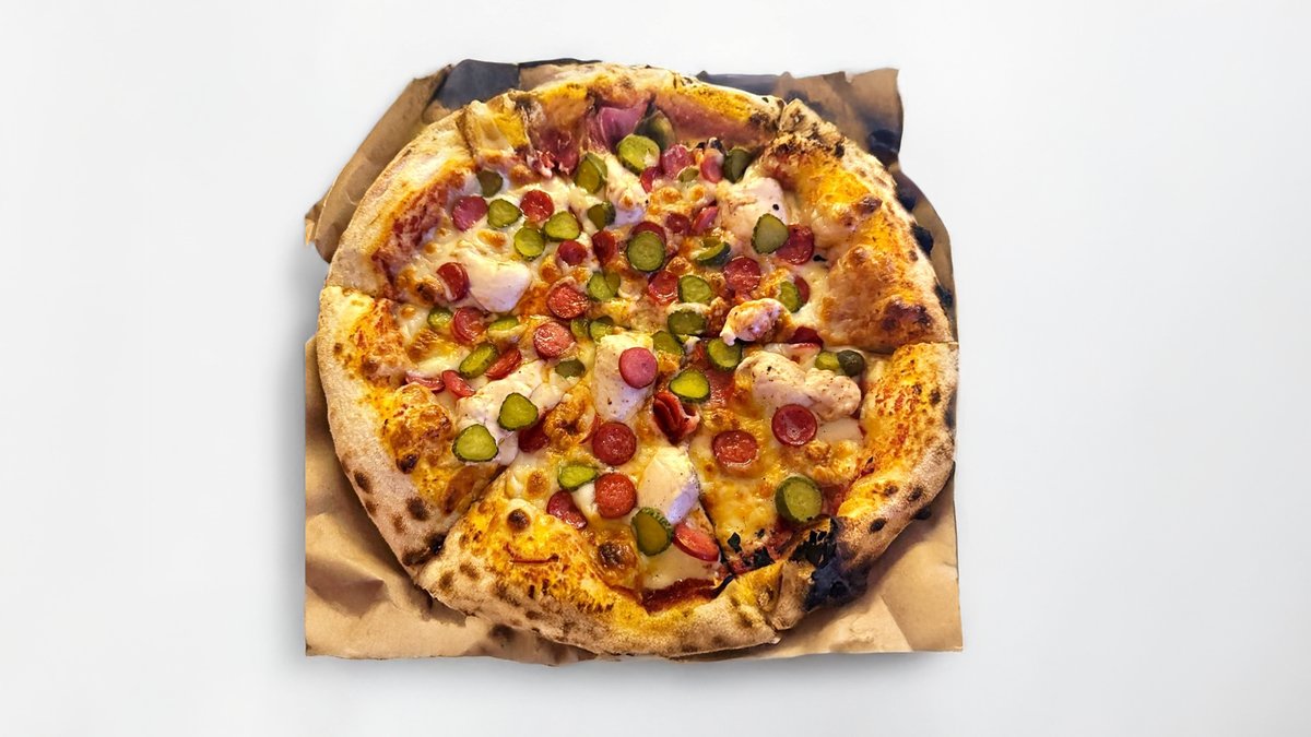 Сыр моцарелла, охотничьи колбаски, корнишоны, куриная грудка, соус томатный