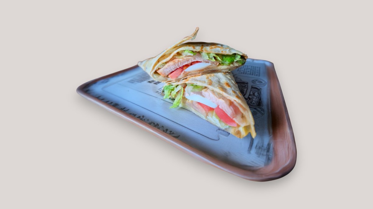 Ветчина говяжья, сыр моцарелла, сыр пармезан, помидор, яйцо вареное, соус.
