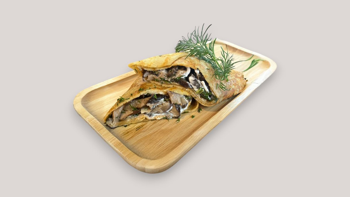 Грибы жареные, сметана, сыр пармезан, сыр моцарела, зелень