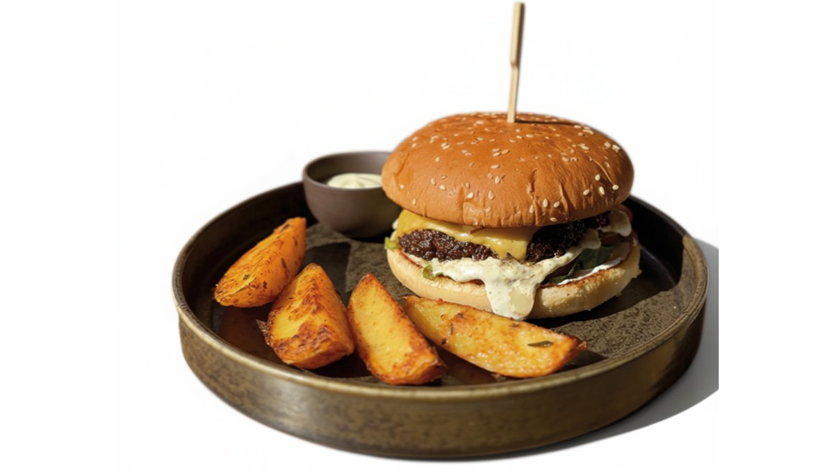 (445 г) Обжаренная булочка с кунжутом, говяжья котлета, лист салата, крем чиз, соус трюфельный, соус горчичный, трюфельное масло, шампиньоны, лук, томаты, чеддер. Подается с запеченным картофелем и соусом блю чиз