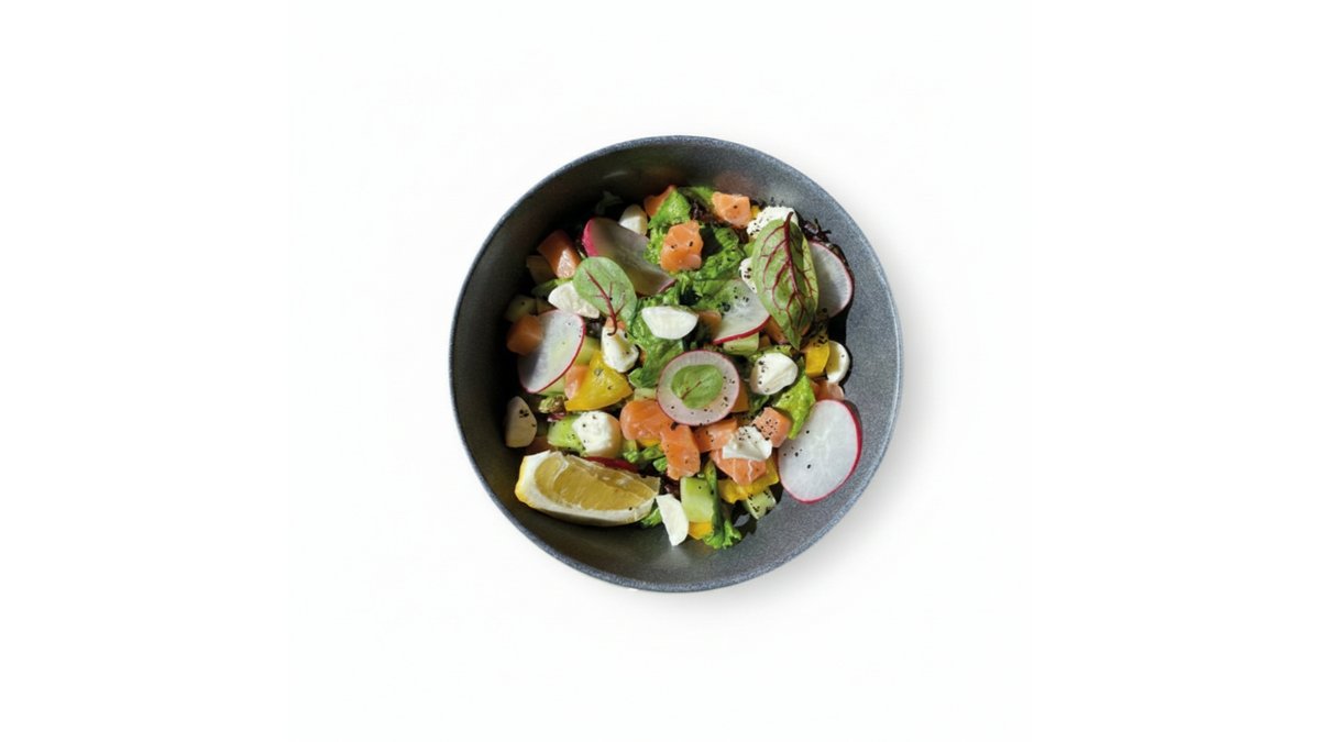(340 г) семга, буффало-мини моцарелла, редис, огурцы, листья салата, болгарский перец, оливковое масло