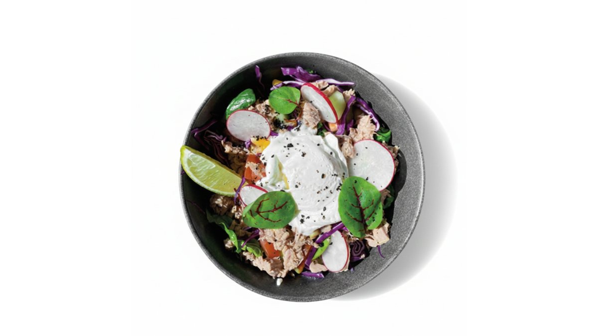 (440 г) помидоры, тунец, красная капуста, редис, шпинат, яйцо пашот, оливковое масло, кукуруза, лайм