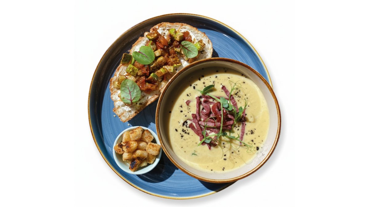 (500 г) крем суп чечевичный, говядина копченая, сухарики, брускетта с крем-чиз, обжаренные цукини и помидоры