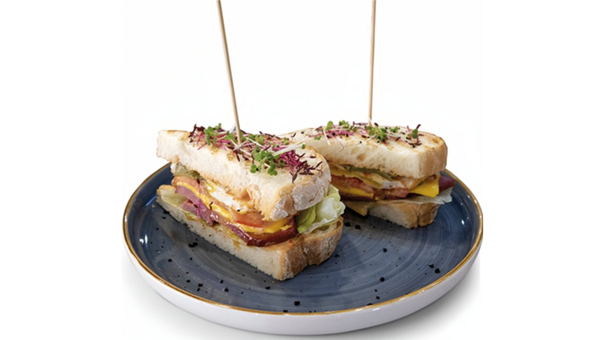 (300 г) тартин, жареное яйцо, говяжья ветчина, грибы, помидоры, салат айсберг, сыр чеддер, фирменный соус
