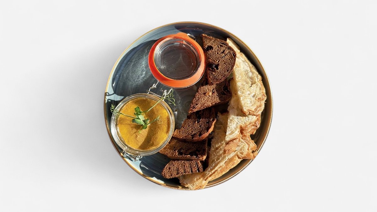 (220 г) Нежный паштет из куриной печени со сливочным маслом, подается с хлебом тартин и хлеб с клюквой