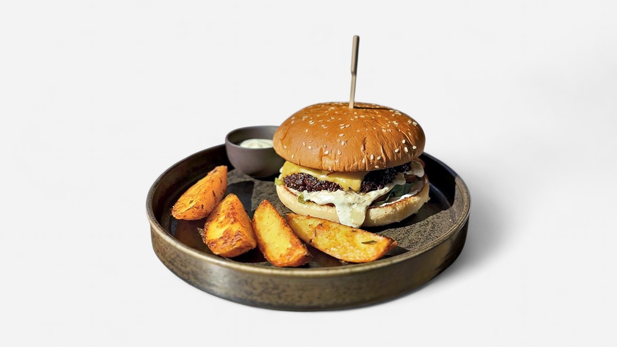 (425 г) Обжаренная булочка с кунжутом, говяжья котлета, 2 фирменных соуса, листья салата, томаты, маринованный огурец, красный лук. Подается с запеченным картофелем и соусом блю чиз