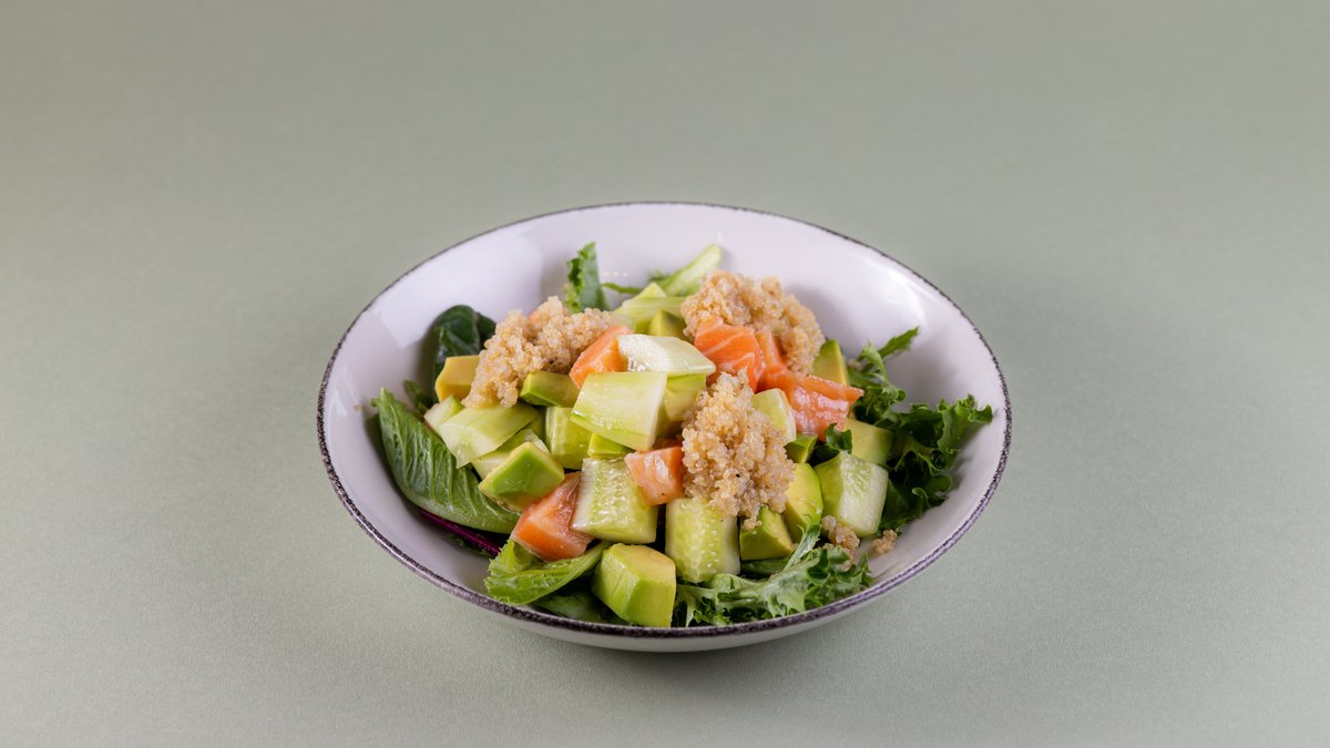 киноа,лосось,шпинат,авокадо,огурец,водоросли чука и нори,оливковое и кунжутное масло