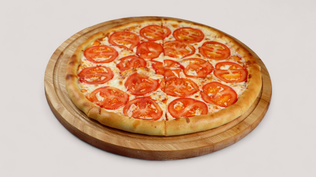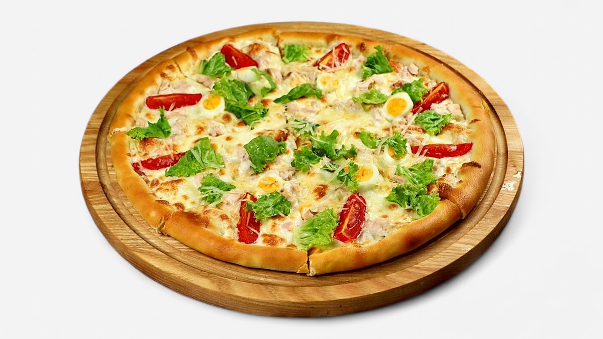 Сыр моцарелла, томаты, томатный соус, копченная курица, болгарский перец, зелень