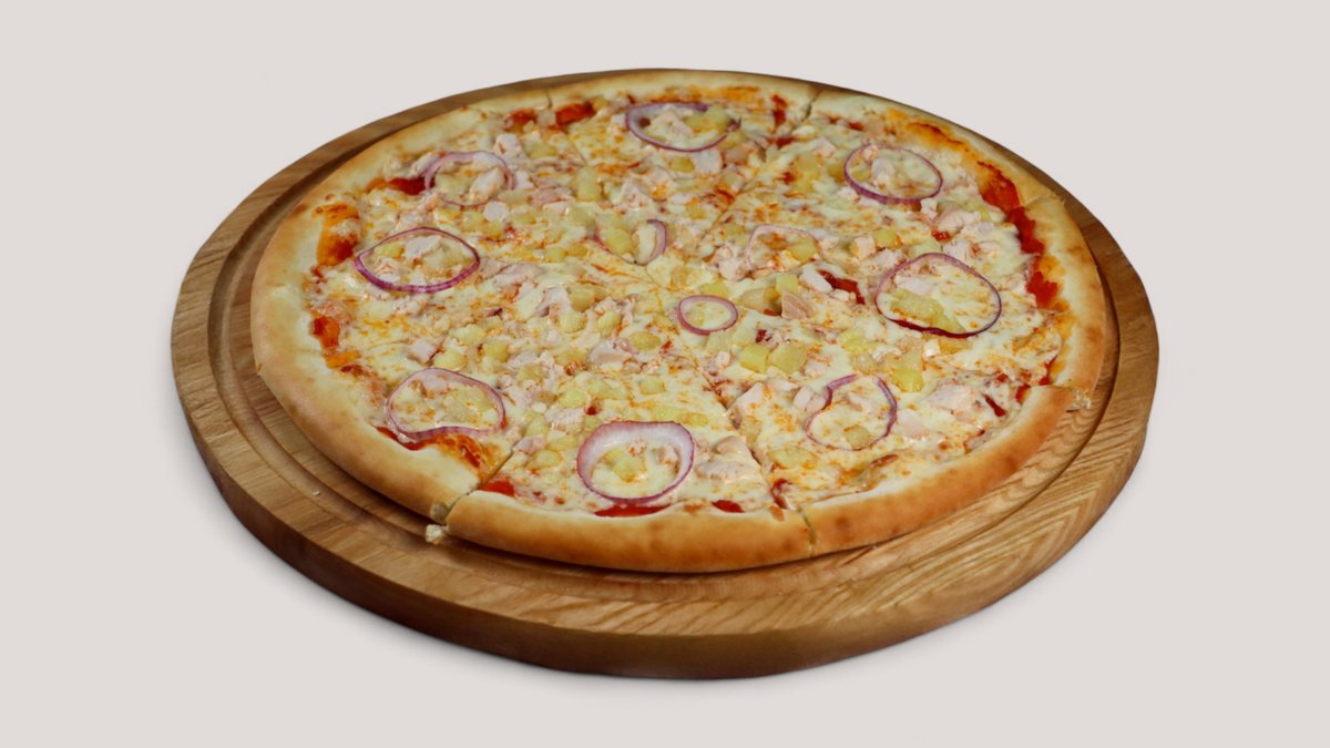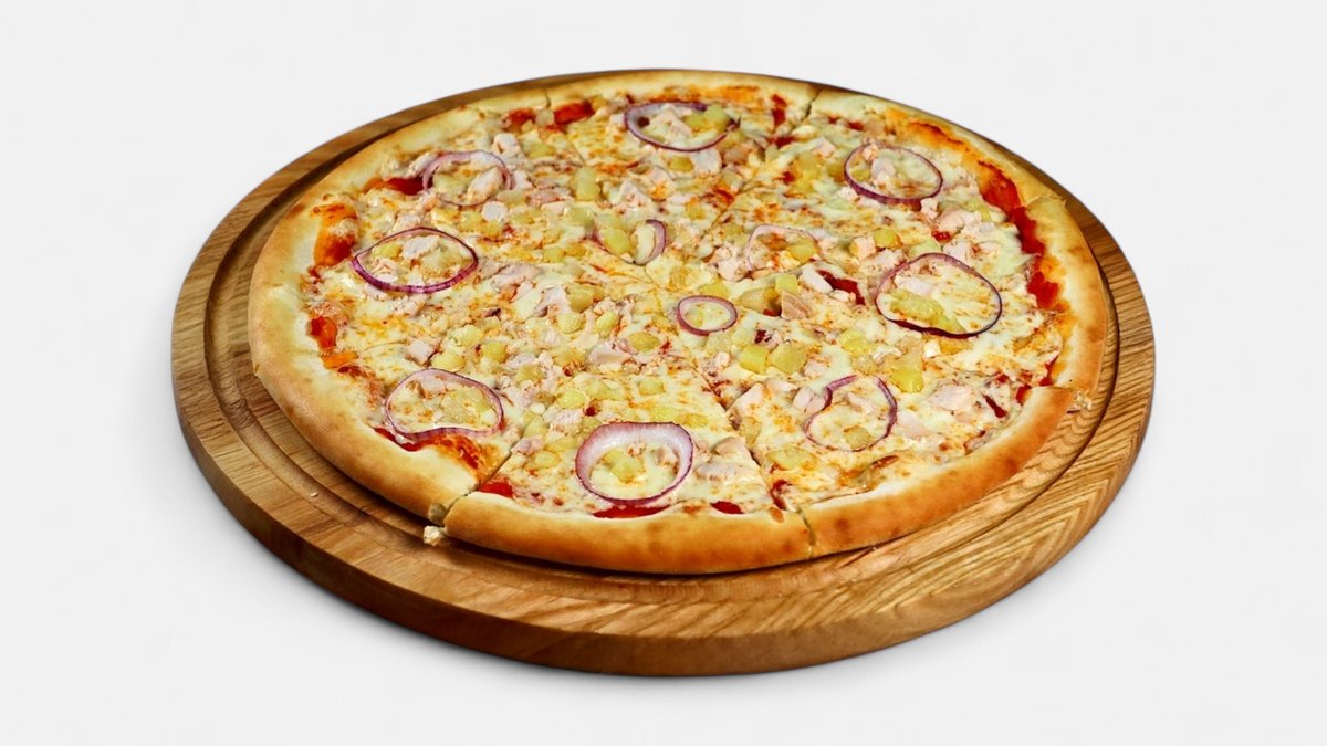 Ананасы, копченная курица, красный лук, сыр моцарелла, соус манго чили