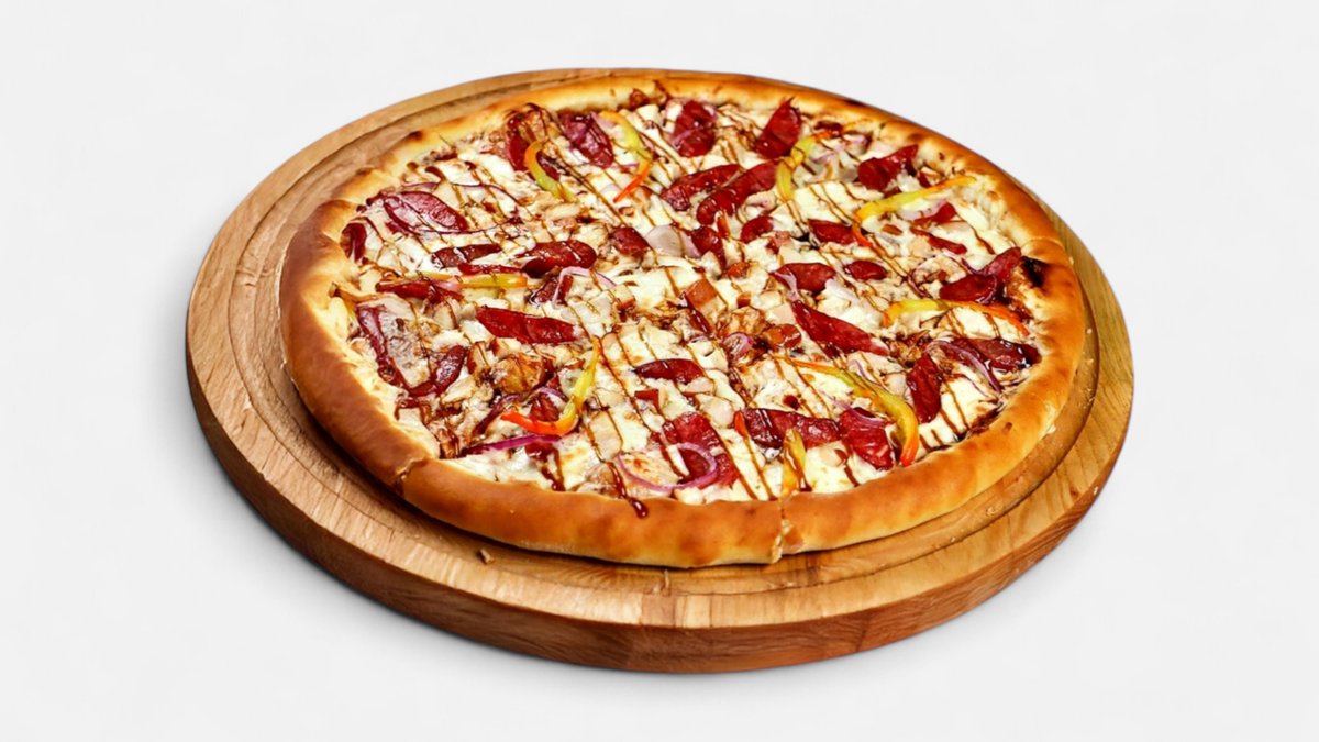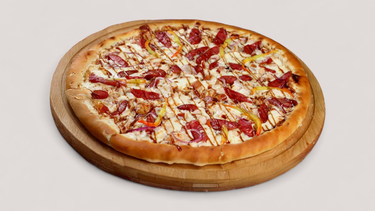 Охотничьи колбаски (Халал), Копченая курица, Красный лук, сыр Моцарелла, соус Устричный