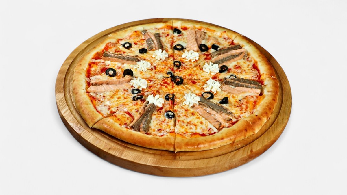 Сыр моцарелла, томаты, томатный соус, лосось, маслины