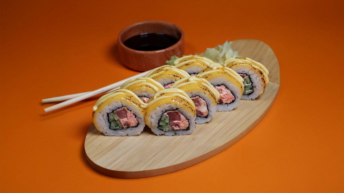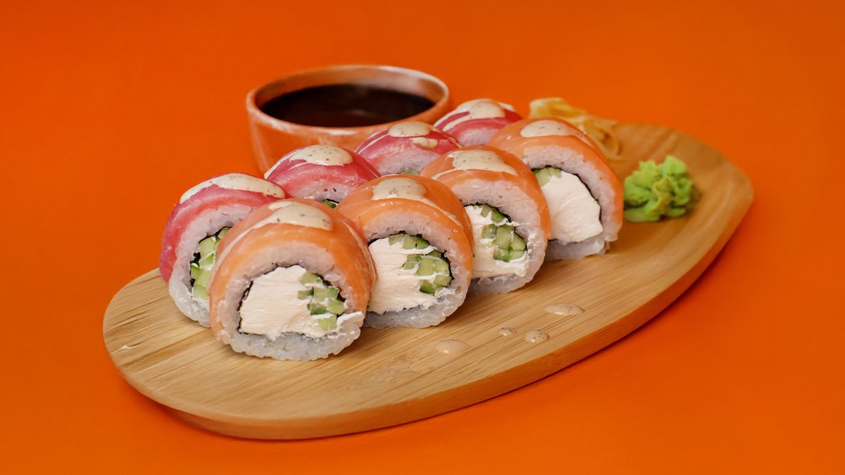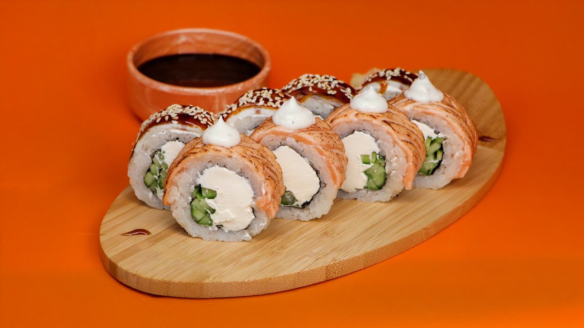 Внутри: сыр, огурец. Шапка: лосось, фирменный соус, поливается унаги